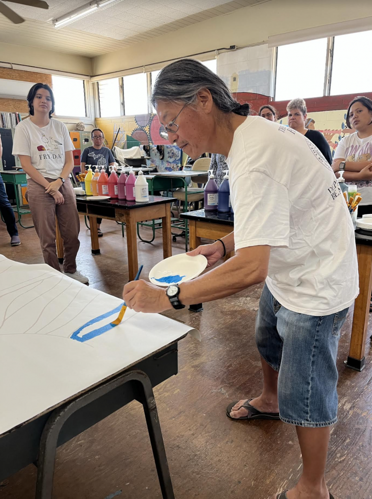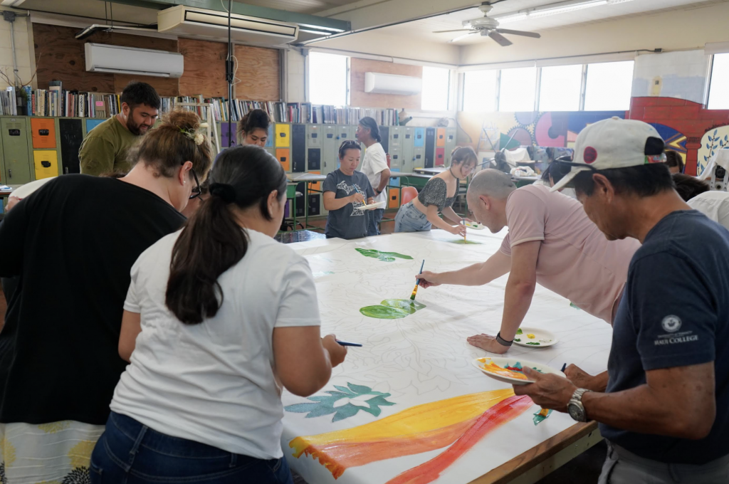 More than 20 students, faculty and staff gathered in the Heona Fine Arts Studio last week to begin work on a new three-panel, 40-foot by 8-foot acrylic on canvas mural. It will be the centerpiece of UH Maui College’s new Student Lounge.