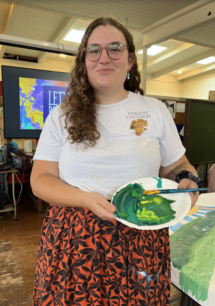 “I am a big fan of public art. I think murals enrich our campus and help us make spaces look more like the ways our community feels. I am not usually a painter,” said student Stephanie Serraglio, who identifies more as a ceramicist, “but I found it relaxing to paint and it was beautiful to see all that we created together, as a group. I would love to participate in the other panels, and I am so excited to see them installed.”