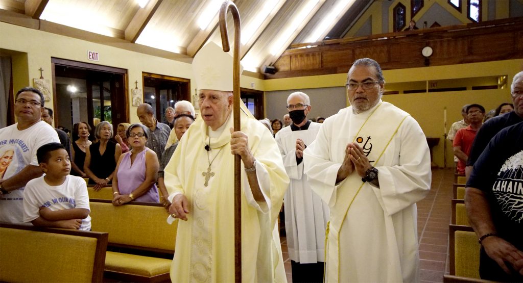Most Reverend Larry Silva, Bishop of Honolulu, led a solemn All Souls Day Mass Thursday evening at Sacred Hearts Mission Church in Kapalua, with wildfire survivors and parishioners of Lahaina’s historic Maria Lanakila Catholic Church.
