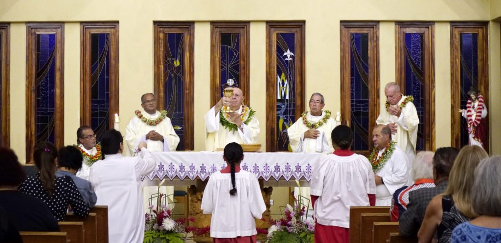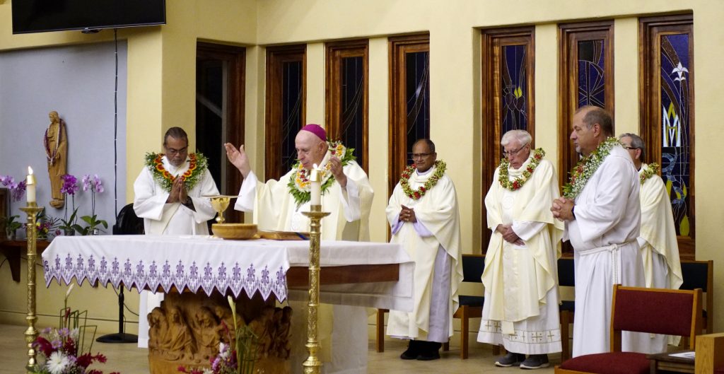 Most Reverend Larry Silva, Bishop of Honolulu, and the Rev. Kuriakose Nadooparambil, pastor of Maria Lanakila Catholic Church, present the Body of Christ during Communion Thursday evening. PC: Bruce Kurosaki photography