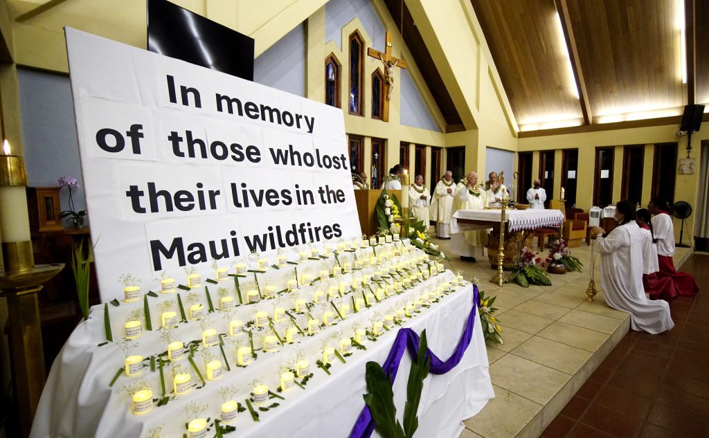 “We have come today to lament with you, to mourn with you, and to grieve with you,” Bishop Silva said in his homily, standing next to rows of flickering candles; each representing a loved one lost in the devastating Lahaina wildfire on Aug. 8. “The grief over loss of property, loss of jobs and loss of precious memories pales in comparison with the grief that we feel over the deaths of those brothers and sisters whose names are recalled to us here. They were, to most of you, much more than names on candles, and the grief over their loss is deep.”