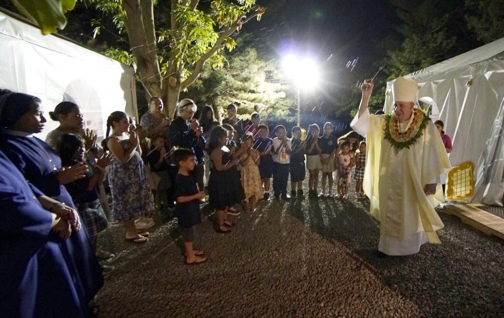 Most Reverend Larry Silva, Bishop of Honolulu, gives his homily Thursday evening, giving solace to Lahaina wildfire survivors and parishioners. “We have come today to lament with you, to mourn with you, and to grieve with you,” he said. PC: Bruce Kurosaki photography