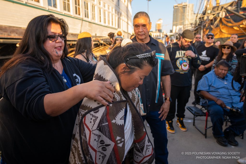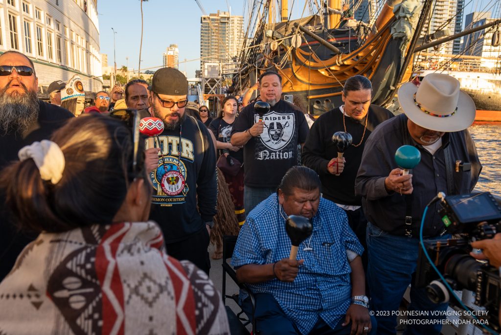 As Hōkūleʻa entered North San Diego Bay and approached Harbor Island Park, the canoe was greeted by dozens of paddlers from the Coronado Canoe Club and other canoe organizations. The flotilla escorted the voyaging canoe to the dock at the Maritime Museum of San Diego where the Kumeyaay tribal hosts awaited the crew’s arrival and greeted them with song and chants.