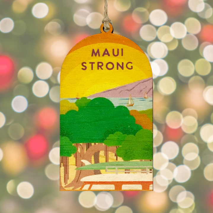 These ornaments feature artwork of Lahaina by Hawaiʻi artists along with the phrase “Maui Strong,” with proceeds from those sales split between all of the small businesses featured in the Maui Biz Ornaments initiative.
