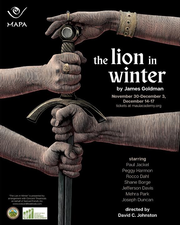 The Lion in Winter is directed by David C. Johnston, Maui Academy of Performing Arts artistic director. The play boasts a cast of seven including Paul Jackel, Peggy Harmon, Jefferson Davis, Shane Borge, Rocco Dahl, Mehra Park and Joseph Duncan.