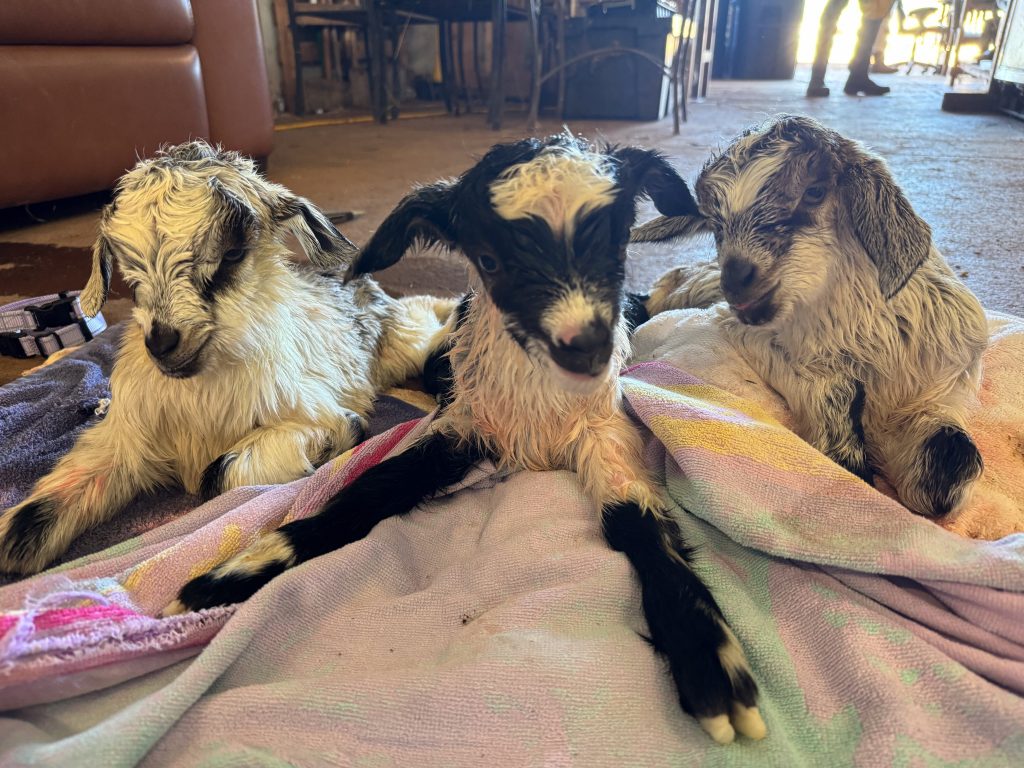 The baby goats are arriving because the farm’s two studs, Hemingway and Prince, have done their jobs well.