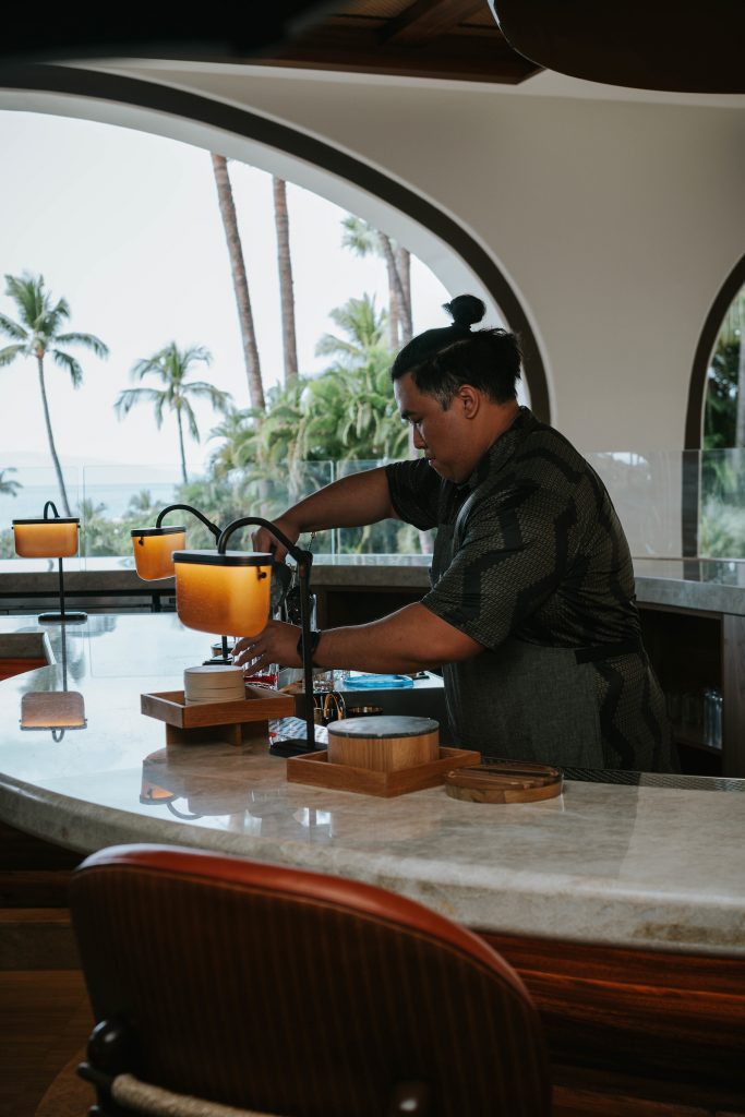 Beyond the bar, Pilina’s culinary selections include sushi and raw dishes, as well as an interactive hot rock experience with proteins and vegetables. Menu selections include Mauka to Makai Tartare featuring Molokaʻi venison, unagi and seaweed or Pilina’s Poisson Cru with lilikoʻi, whipped coconut, and salted cucumber.