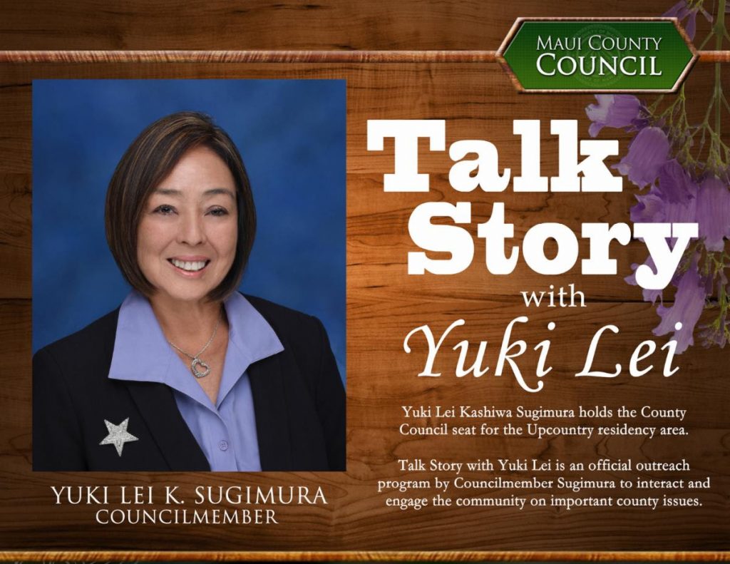 Maui County Council Member Yuki Lei Sugimura will hold two talk story sessions Upcountry this week. The first session takes place tonight (Feb. 6) at the Kula Elementary School cafeteria from 6 to 7 p.m. Sugimura will also hold her monthly Talk Story with Yuki Lei outreach program, Feb. 10, at the Upcountry Farmers Market from 7 to 11 a.m.