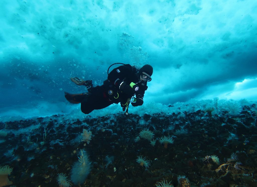 Moran’s lab has studied polar gigantism for more than a decade. In October 2021, during a field research expedition to Antarctica, the team, including Moran and School of Life Sciences PhD students Aaron Toh and Graham Lobert, made a groundbreaking discovery. Diving under the ice, they hand-collected groups of giant sea spiders that appeared to be mating and transported them to tanks for observation.
