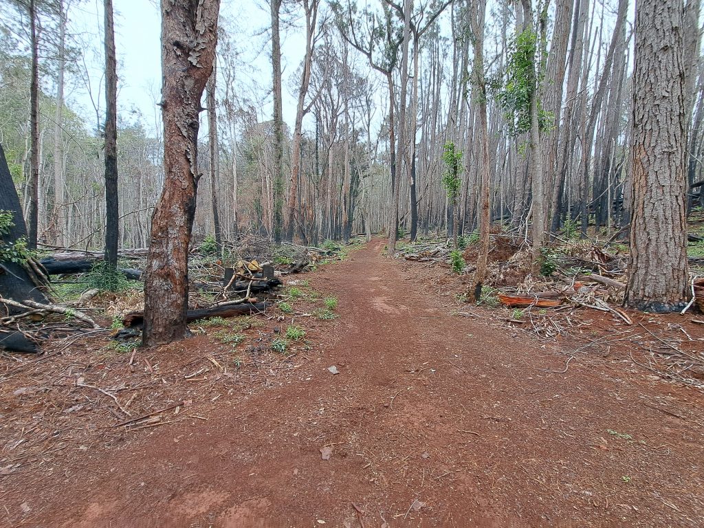 Substantial windfall and burn damage from the August 2023 Olinda Fire kept DLNR Division of Forestry and Wildlife (DOFAW) crews busy and prevented visitation to the reserve due to safety concerns. Some trees were partially broken or had hanging limbs, while others were leaning or had fallen over completely, blocking the trail corridor.
