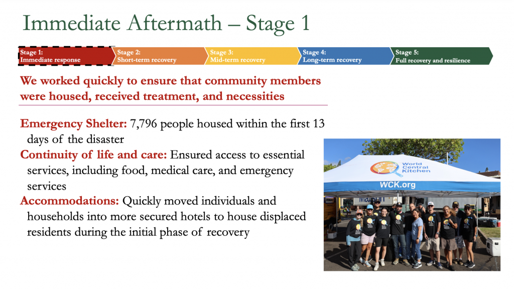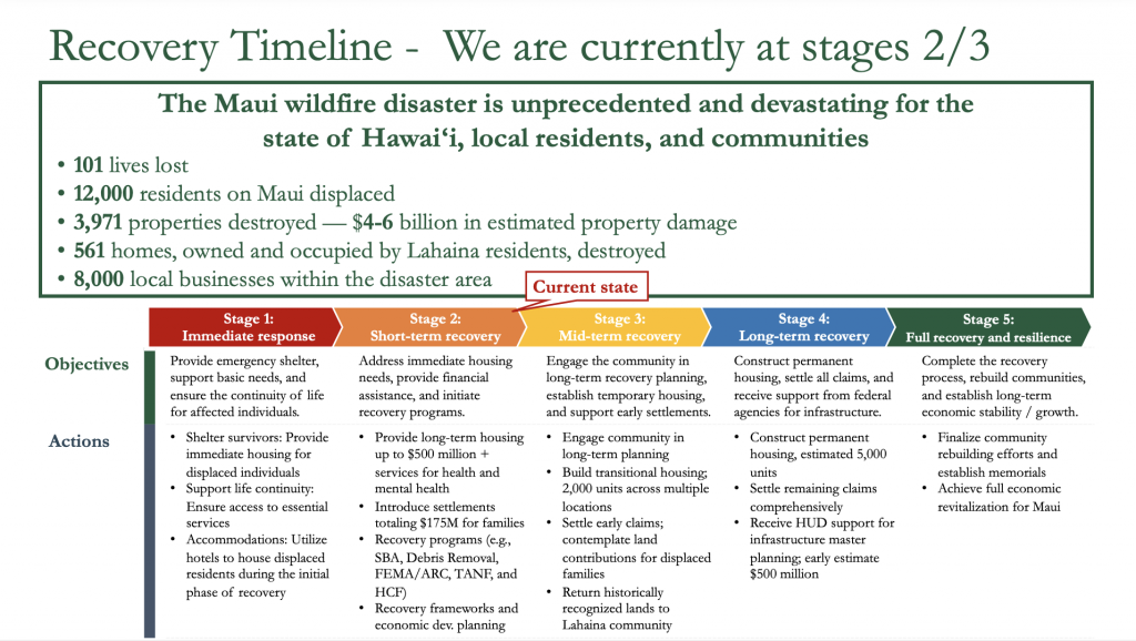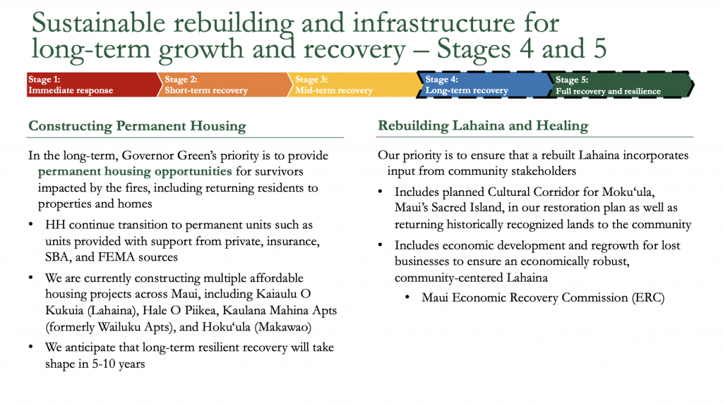 As recovery and rebuilding efforts continue, Gov. Green emphasized the crucial role of cross-stakeholder collaboration and community input as recovery and rebuilding efforts continue. “We are not just constructing buildings; we are restoring livelihoods and communities,” the governor said in a news release. “Our continued efforts for the people of Maui will ensure that every resource we have is deployed effectively, and every family receives the help it needs to rebuild.”