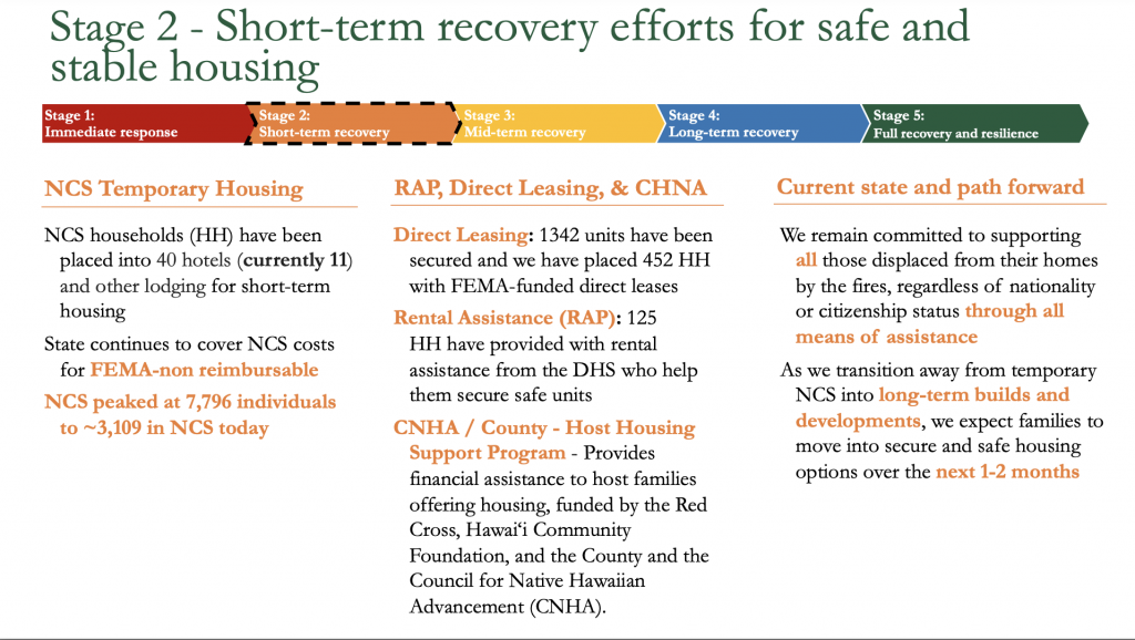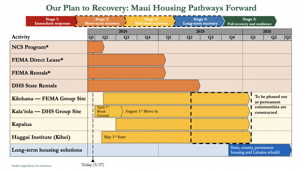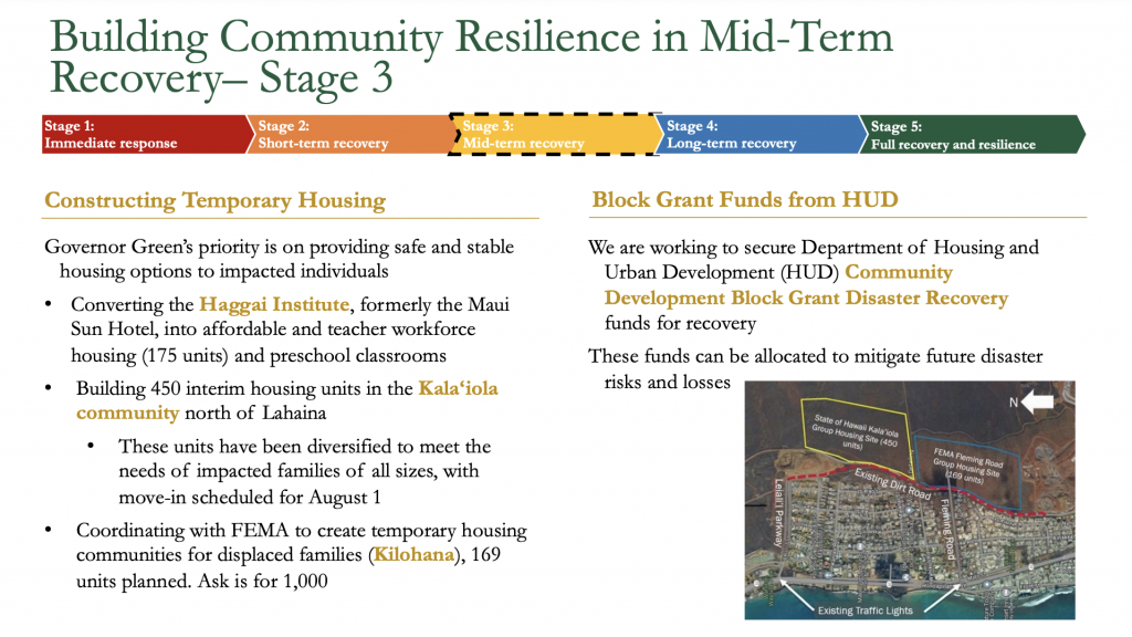 Transitional housing units as outlined as part of Phase 3 of recovery plan includes mid-term housing at Leialiʻi with the Kilohana FEMA Group Site, 450 units at the Kalaʻiola DHS Group Site, 50 units at Kapalua, and 175 units at the Haggai Institute in Kīhei. These units will be phased out as permanent communities are constructed.