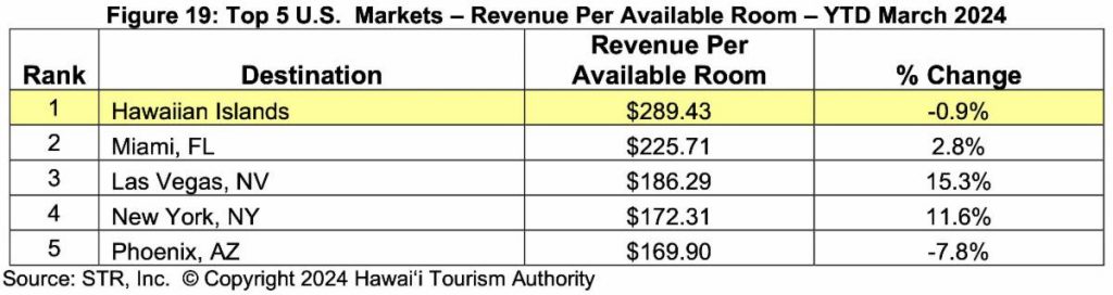 Maui County hotel performance remains affected by the aftermath of the August wildfires, reports the Hawaiʻi Tourism Authority, but the county still led the state in revenue per available room in March due to comparatively higher average daily rate.