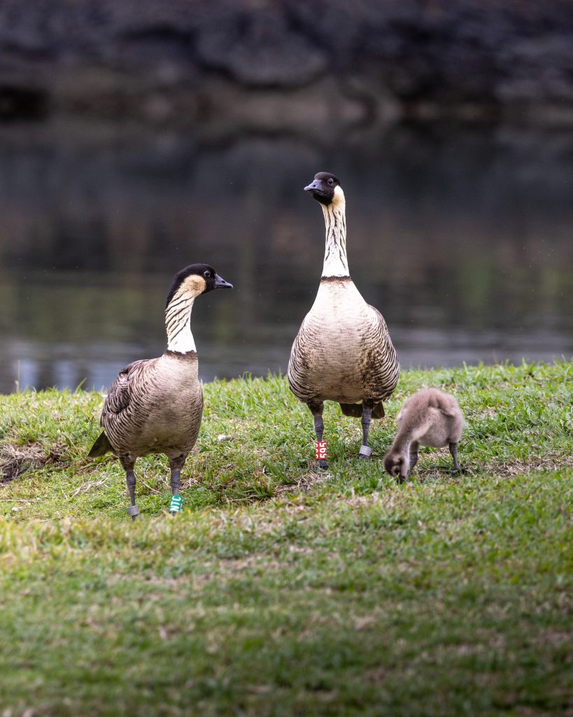 The gosling’s mother, tagged as NTC, was the same bird that had another chick taken from her by a woman at another Hilo park in March, 2023. “We know cat lovers are animal lovers. We’re encouraging people who are feeding cats, sometimes in very large colonies, to consider the deadly consequences. We know, as animal lovers their hearts are in the right place, but in addition to caring for wild cat populations please consider the tragic impacts imposed on two of the most iconic wildlife species in Hawai‘i, nēnē and monk seals. Open your hearts to them above non-native species like cats,” McGuire said.