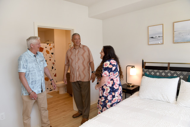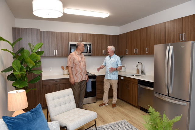• Mayor Bissen and Kerry Nicholson of Legacy Partners toured a two-bedroom apartment at the grand opening of Kaulana Mahina. PC: Kaulana Mahina