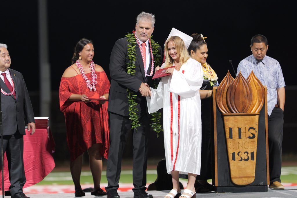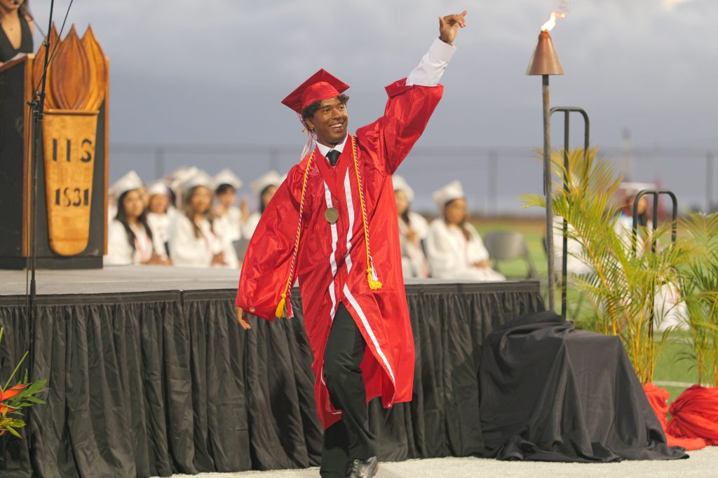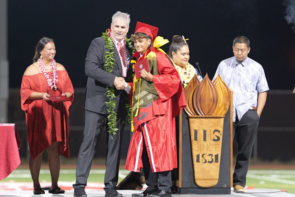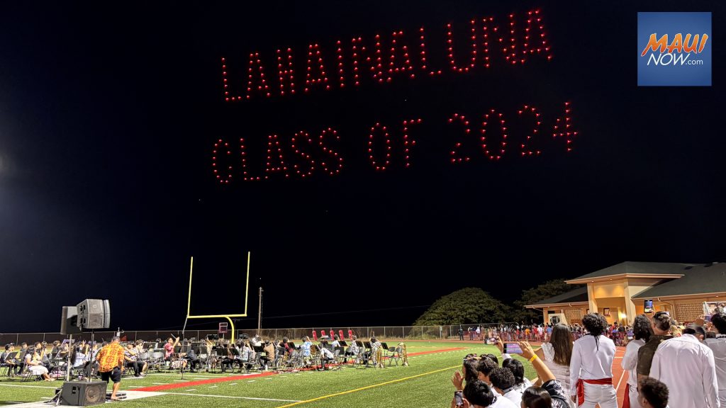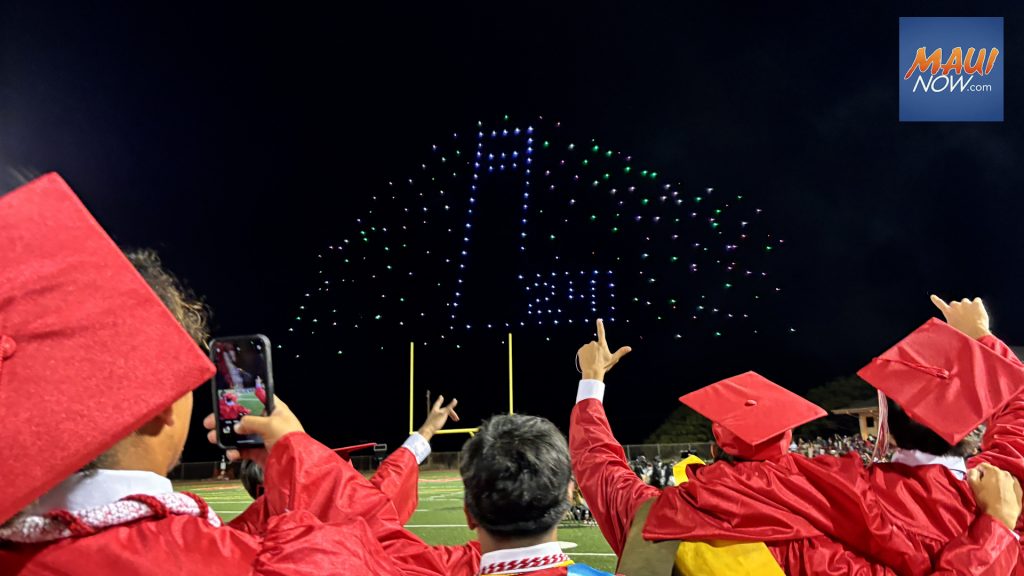 Following the singing of the alma mater, graduates and families were treated to a surprise drone light show by Sky Elements and sponsored by the Downtown Athletic Club of Hawaii (DCAH). The DCAH raised over $1 million to support Lahainaluna student-athletes.