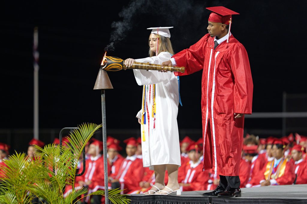 After the presentation of the diplomas, alumni from the class of 2024 and volunteers led the traditional lighting of the “L” on Pu‘u Pa‘upa‘u above the campus.