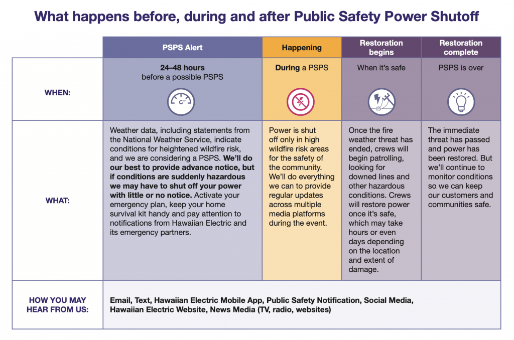 How much advance notice will be given for PSPS events? Hawaiian Electric reports it will try to provide as much advance notice as possible. In a best-case scenario, we will send a warning notification 24-48 hours before a PSPS begins. However, if conditions are suddenly hazardous, HECO may need to shut off power with little or no notice.