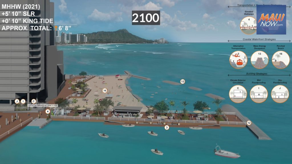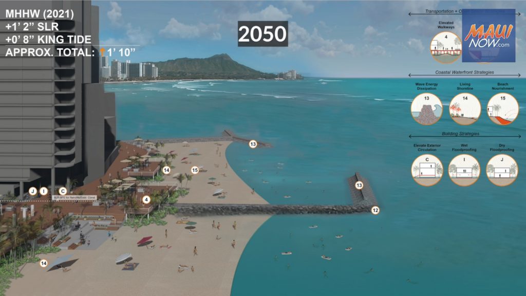Sea level in Waikīkī is projected to rise up to about one foot by 2050 and nearly six feet by 2100 due to climate change, prompting University of Hawaiʻi at Mānoa researchers to create architectural renderings that illustrate possible adaptation strategies.