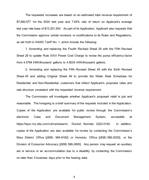 The Hawai‘i Public Utilities Commission will hold a public hearing July 8 on the rate application by Hawaiʻi Water Service Company Inc.