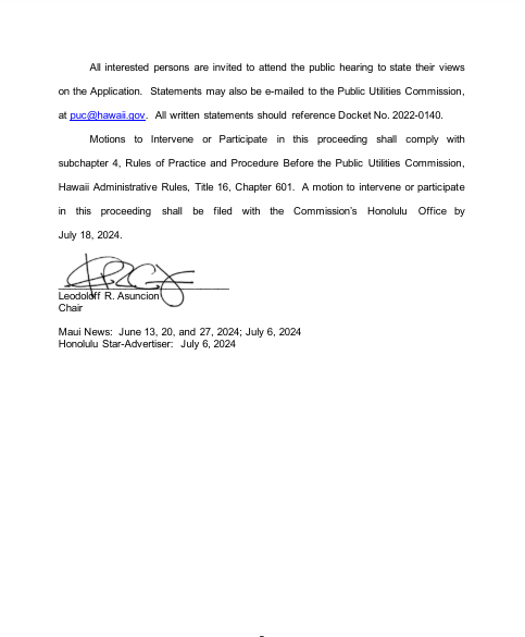 All are invited to attend and provide oral comments during the hearing. Written comments are also encouraged and should reference Docket No. 2022-0140. Statements may also be e-mailed to the Public Utilities Commission at puc@hawaii.gov.