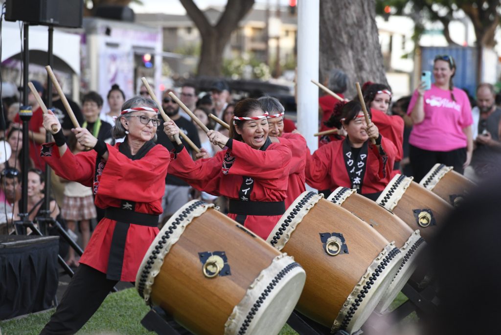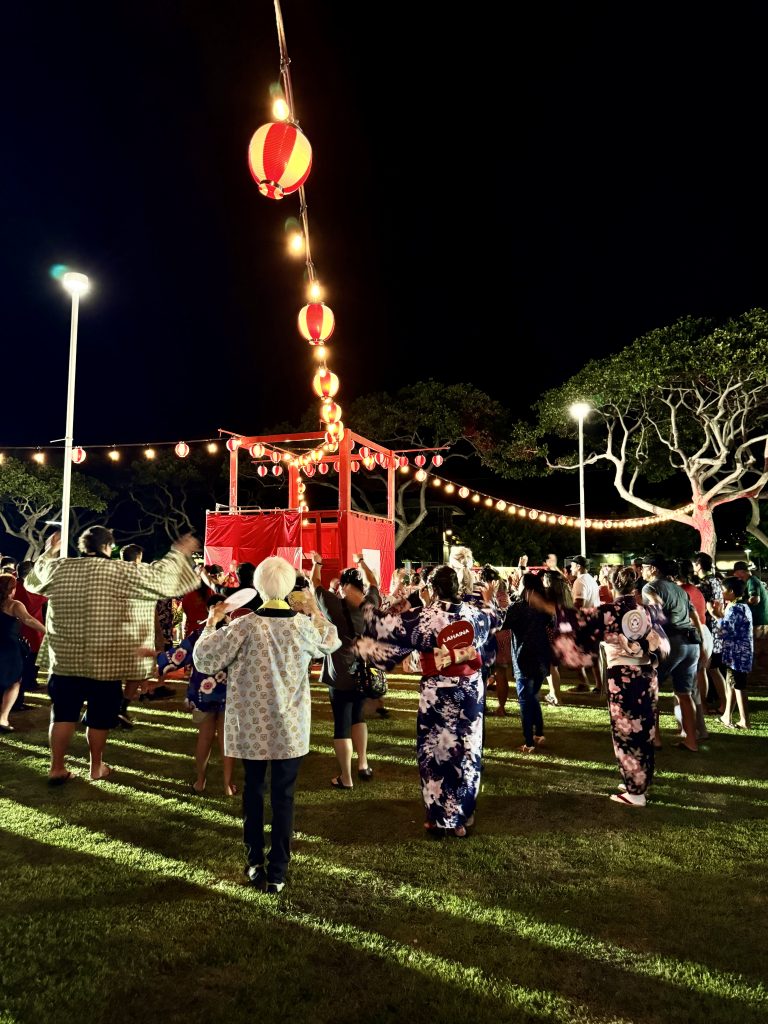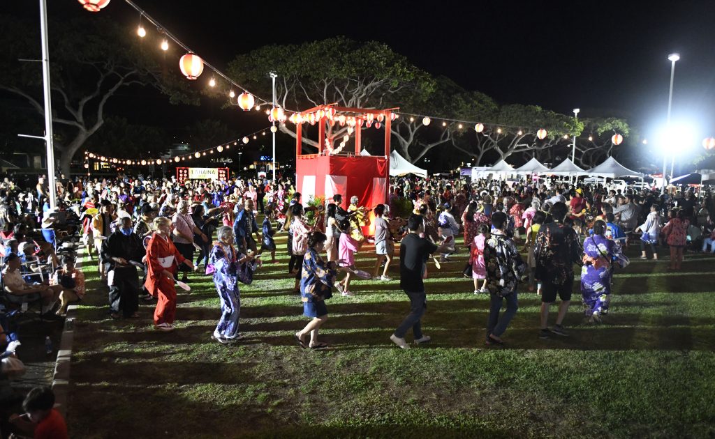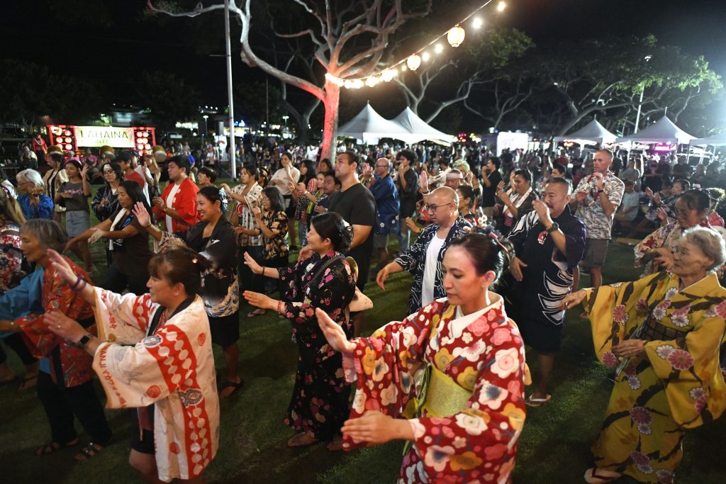 On Saturday evening, Lahaina Obon Festival drew a crowd of well over 1,000 to Lahaina Cannery Mall for a special Obon of Japanese dance and music to honor ancestors and those who have recently passed. Lahaina Hongwanji Mission, Lahaina Jodo Mission and Lahaina Shingon Mission, which lost their temples in the fire, combined to host the gathering that reunited temple members and others in the community.