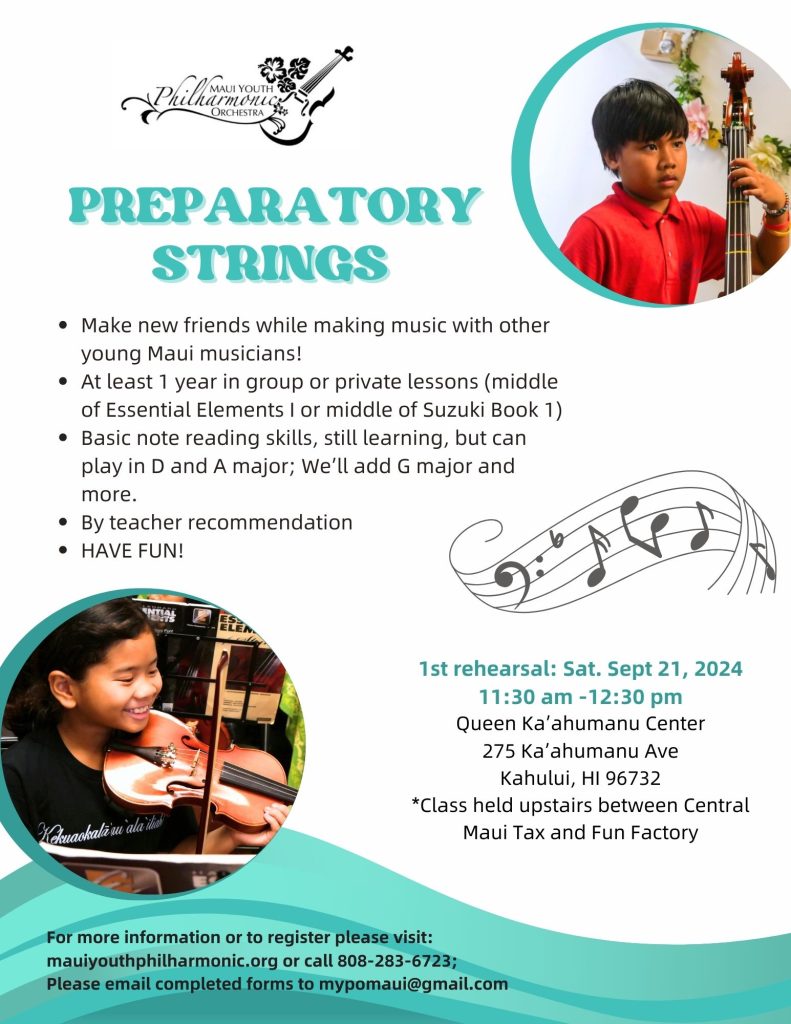 - Preparatory Strings: For students with at least one year or more of experience, 11:30 a.m. to 12:30 p.m., beginning Sept. 21.