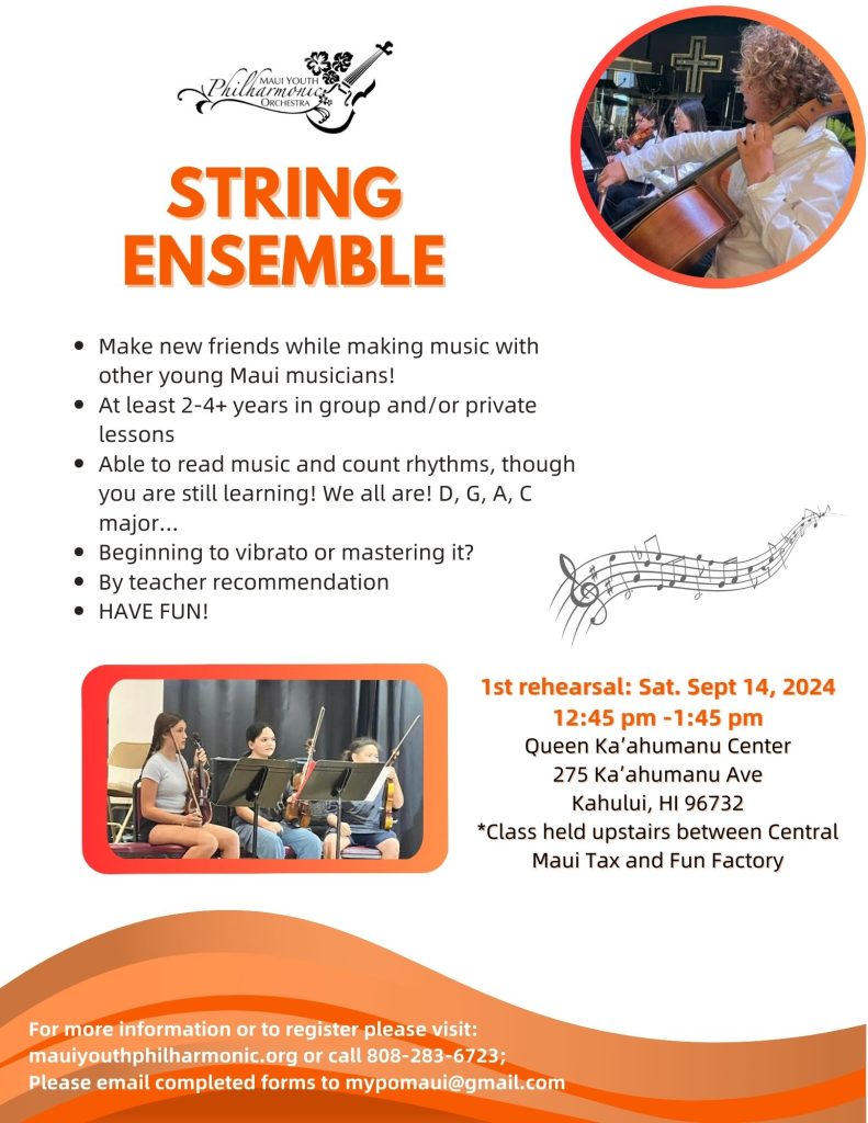 - String Ensemble for Intermediate Level Students: 2-4+ years of experience, 1:45 to 2:45 p.m., beginning Sept. 14.
