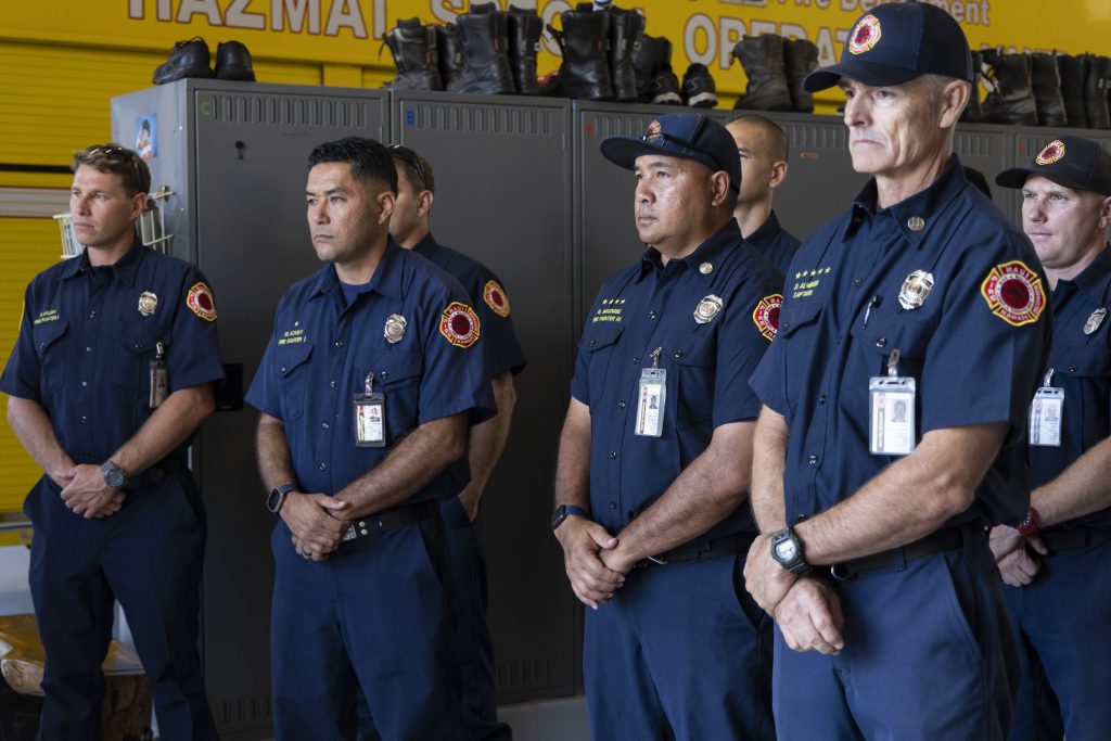 Fire Chief Brad Ventura, Deputy Chief Gavin Fujioka, Assistant Chiefs Henry “Hanale” Lindo and Jeffrey Giesea and others, including firefighters from Kahului Engine, Tanker, Rescue and Hazmat crews, attended the ceremony at the Kahului Fire Station.
