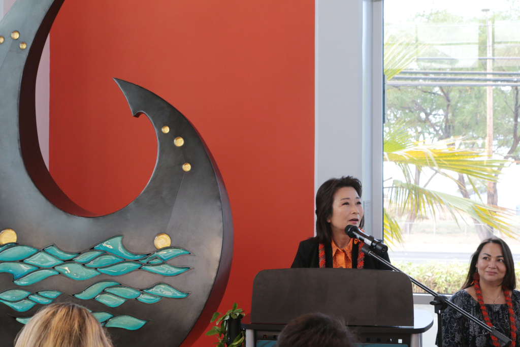 The “Mānaiakalani” sculpture by Fitzel was dedicated at Nānākuli Public Library in Waiʻanae on Saturday, Sept. 21. Speakers included Lt. Gov. Sylvia Luke, Sen. Cross Makani Crabbe, and City & County of Honolulu Neighborhood Board No. 36 Chair Samantha Decorte.