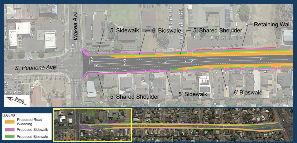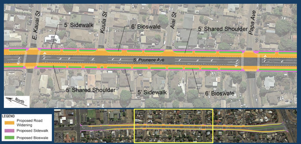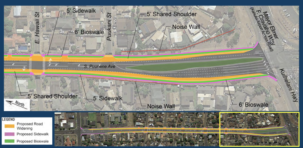 The project, to widen Puʻunēnē Ave. from two to four lanes between Wākea Ave. and Kūihelani Highway, is expected to begin in January 2025. Multimodal and safety improvements planned as part of this project include: a contiguous paved shoulder, new sidewalks on both sides of Puʻunēnē Ave., a landscaped median between Puʻukani St. and Mayor Elmer F. Cravalho Way, two noise walls, enhanced street lighting, new signage and updated drainage and storm water management. Construction of these improvements is expected to run through Spring 2026.