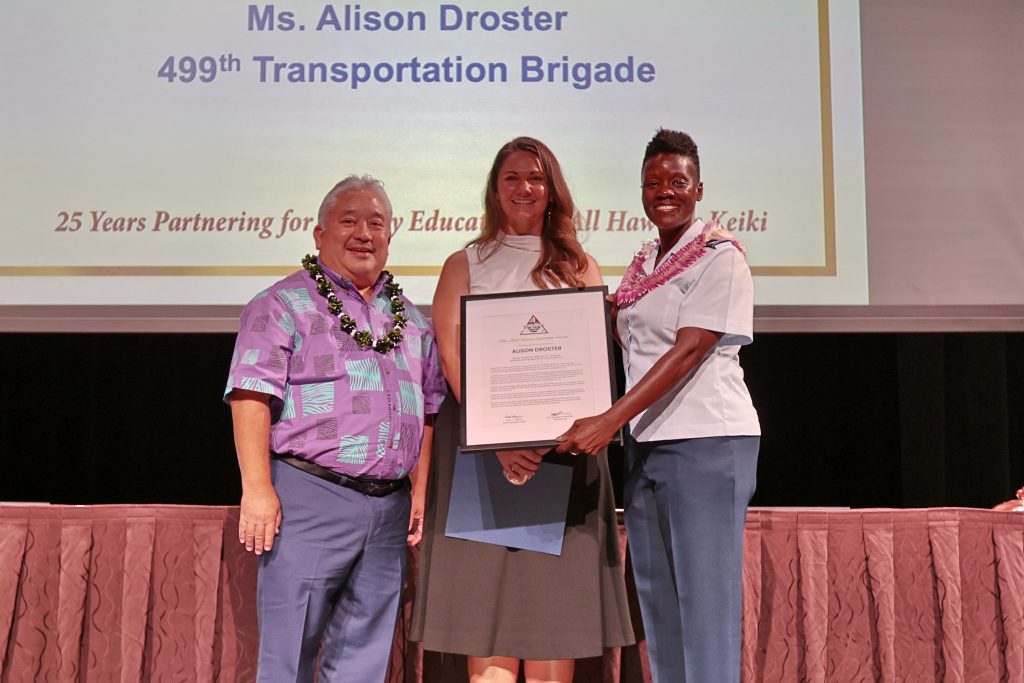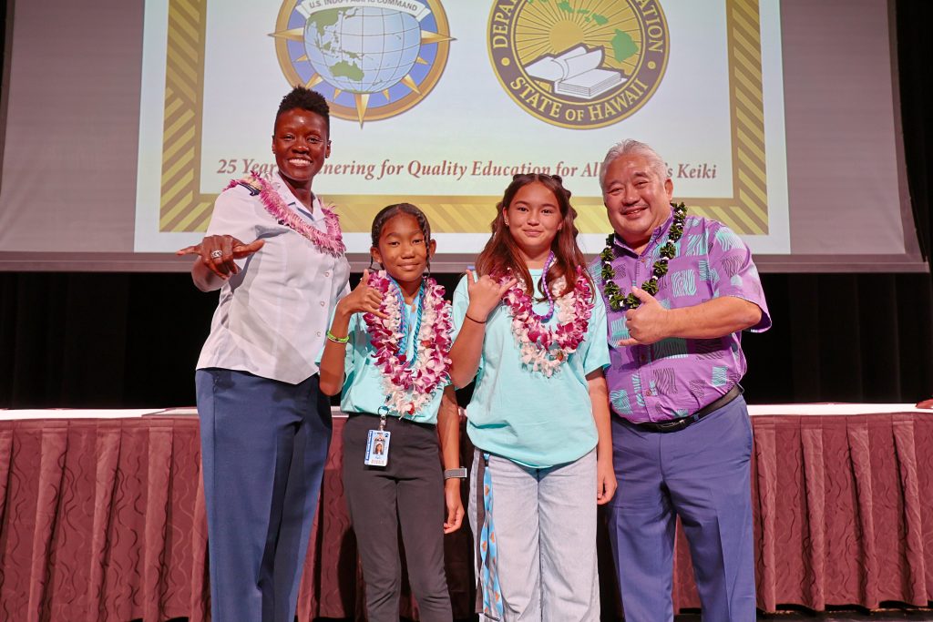 The event honored 137 volunteers. This year’s Daniel K. Inouye Outstanding Military Contributor Award went to Alison Droster of Wheeler Army Airfield for her dedication to Wheeler Elementary, supporting ceremonies, reading events, and annual Fun Day activities. Erynn Tait, Transition Center Coordinator at ʻEwa Makai Middle, received the K. Mark Takai Outstanding Civilian Contributor Award for her leadership in expanding Transition Center programs across Hawaiʻi schools.