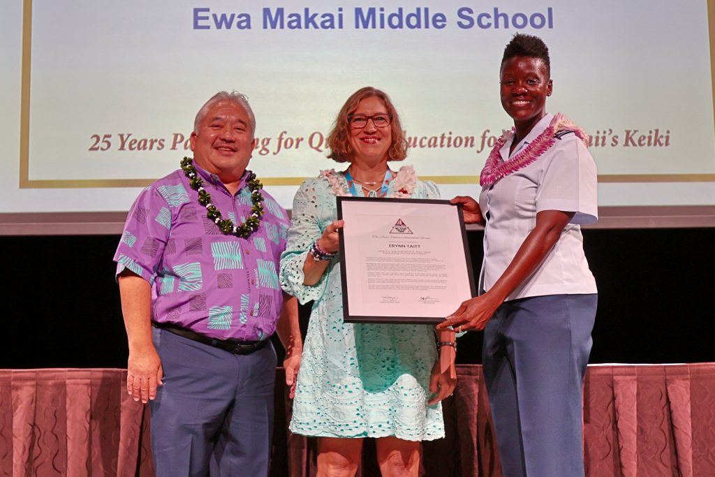• Erynn Tait (center), Transition Center coordinator at ʻEwa Makai Middle, receives the K. Mark Takai Outstanding Civilian Contributor Award. PC: Hawai‘i State Department of Education