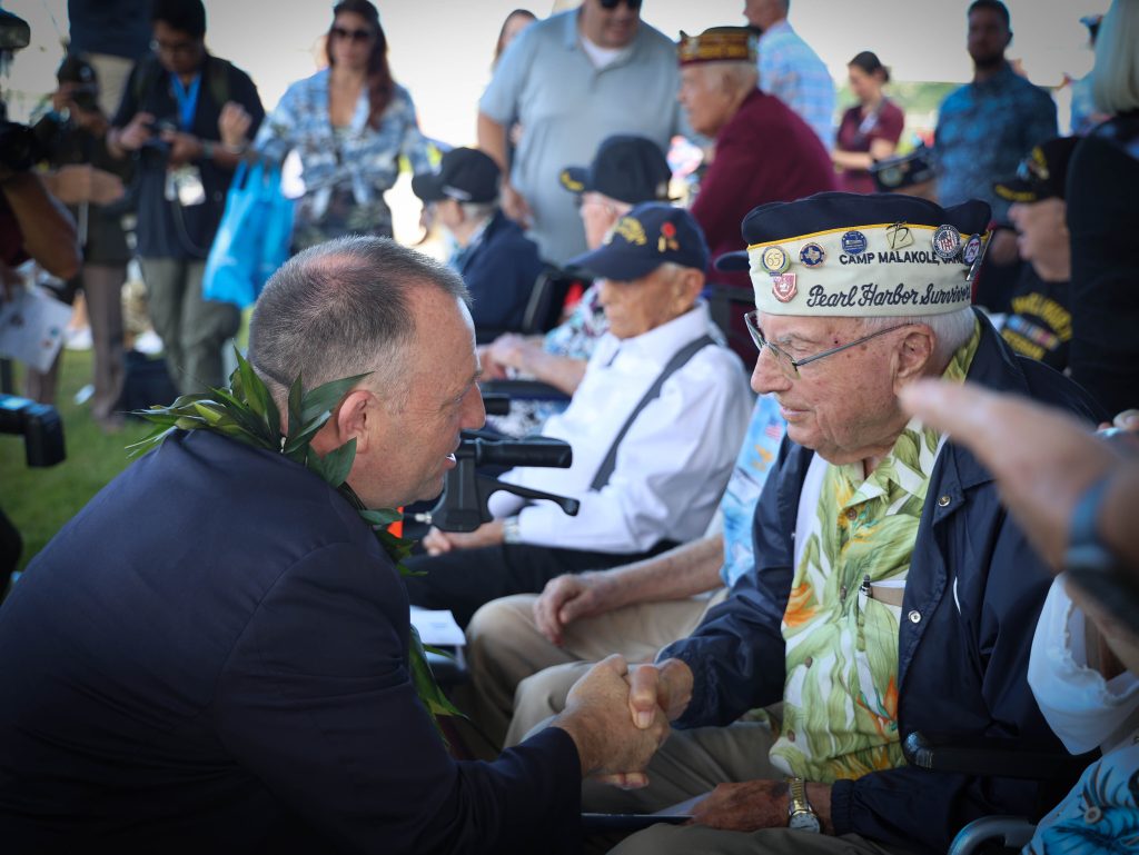 “First Lady Jaime Kanani Green and I will join in solemn reflection at the Pearl Harbor National Memorial to honor the lives lost on Dec. 7, 1941. The day serves as a poignant reminder of the courage and sacrifices made by the thousands of men and women whose bravery in the face of unimaginable adversity shaped the course of history. Their memory continues to inspire our dedication to peace and resilience as a state and as a nation,” said Green.