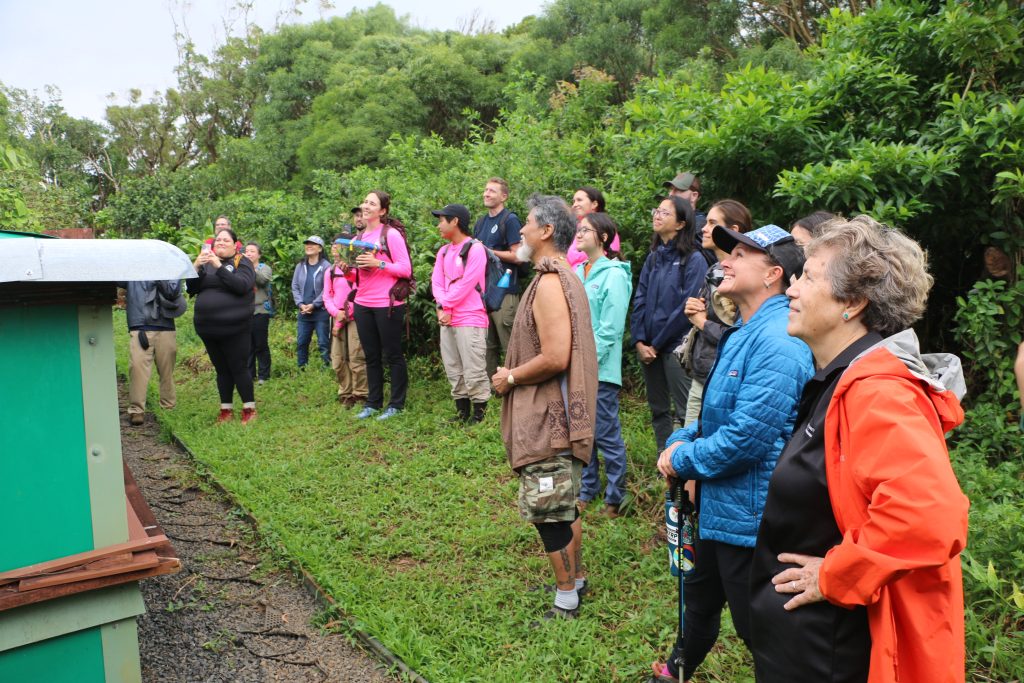 For a reintroduction ceremony, staff from the DLNR Snail Extinction Prevention Program were joined by partners from the US Fish and Wildlife Service, the University of Hawai‘i at Mānoa and the DLNR Division of Forestry and Wildlife. To open the proceedings, Sam ʻOhu Gon led an oli for the protection and joyous return of the species to the wild.
