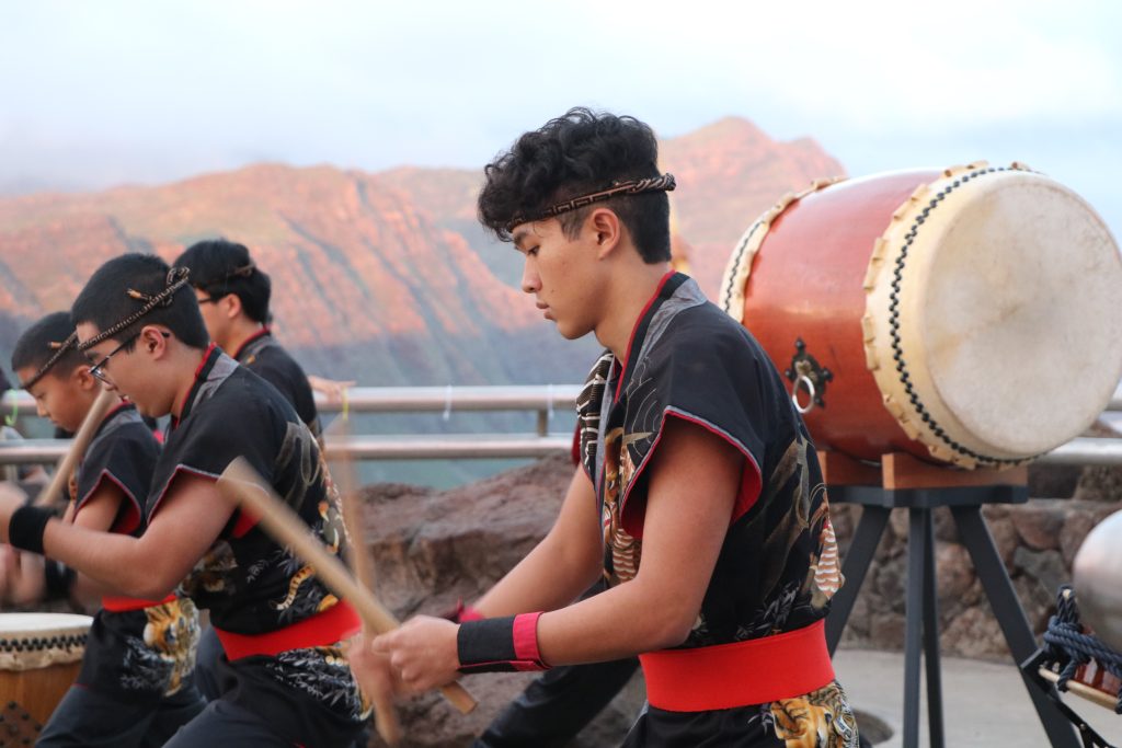 Hawai‘i’s host culture is represented by Kumu Sam Gon and Halau Mele with the blowing of pū and oli just prior to the rising sun. Asian culture is celebrated with a rousing performance of Japanese taiko drums from students of the nonprofit Taiko Center of the Pacific.