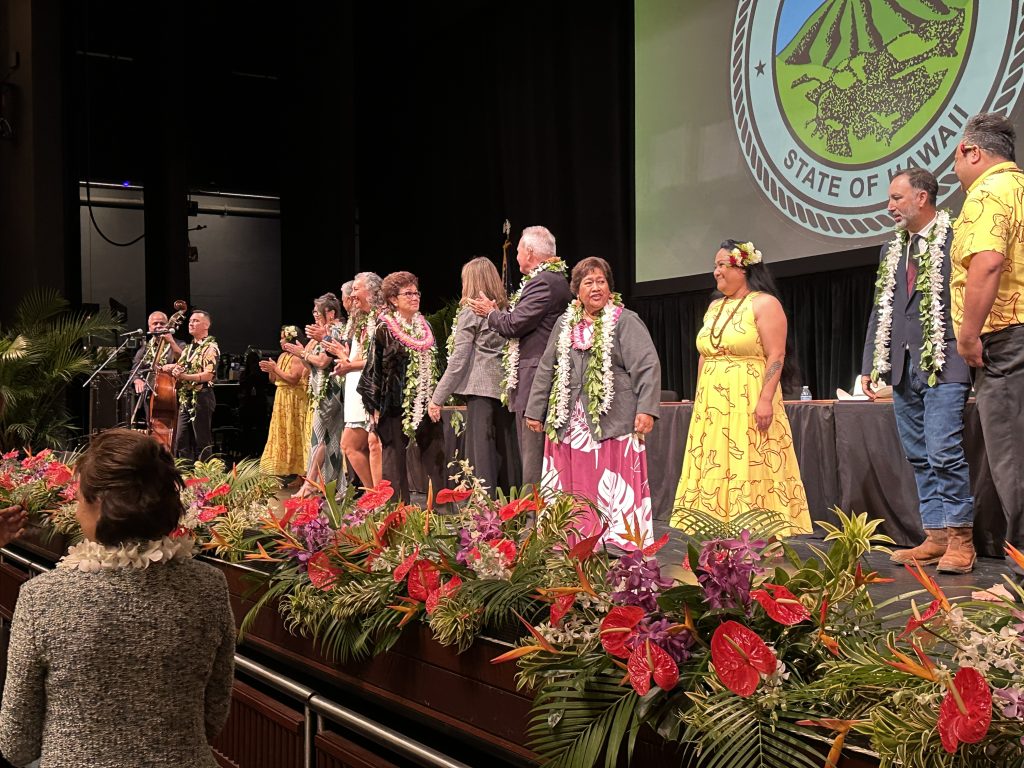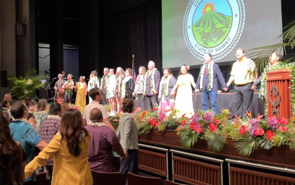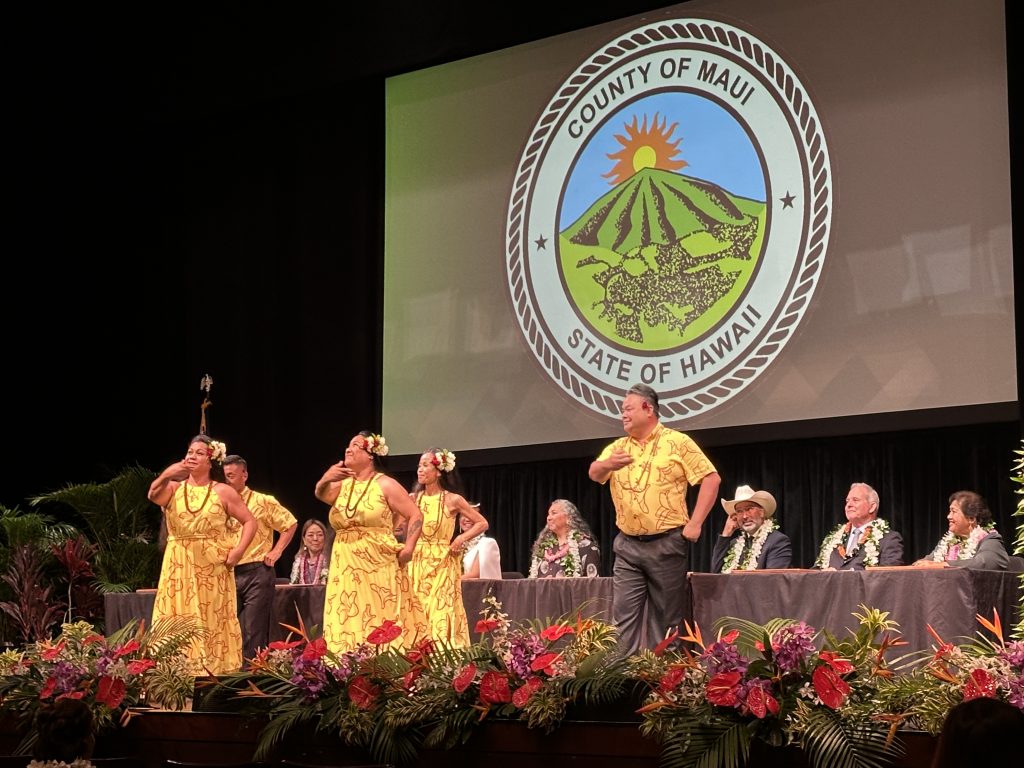 Maui County Council members celebrated their inauguration for the 2025-2027 term with Hawaiian oli, singing and hula this morning at the Maui Arts & Cultural Center’s Castle Theater.