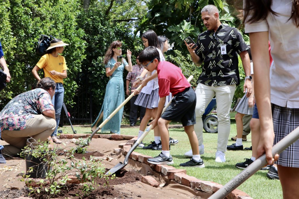 The grounds of Washington Place now have additional native vegetation, as Gov. Josh Green M.D., First Lady Jaime Kanani Green, and DLNR Chair Dawn Chang joined students from St. Andrew’s School in a community Earth Day planting ceremony.