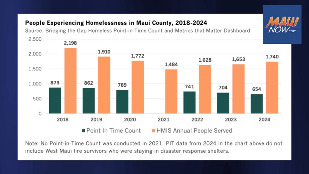 The report found that homelessness impacts Native Hawaiians disproportionately, compared with other groups in Maui County. Nearly 1 in 4 of people served by the homelessness support system were under the age of 18. And, while the number of unhoused people in the annual “Point in Time” Count had decreased, year over year, the number of people served by the homelessness system increased.