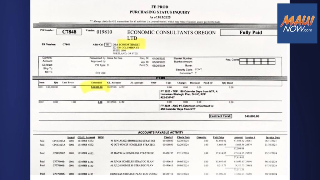 Now, as the county’s housing critical housing shortage continues and homeless encampments crop up in secluded areas, Maui County Council members are questioning the legality of the change in homeless plan’s contracted scope of work. West Maui Council Member Tamara Paltin said a comprehensive homeless plan is needed “now more than ever” after the wildfires. The County’s $240,000 was “misspent,” she said, and a “huge opportunity” to diminish homelessness was “wasted.”