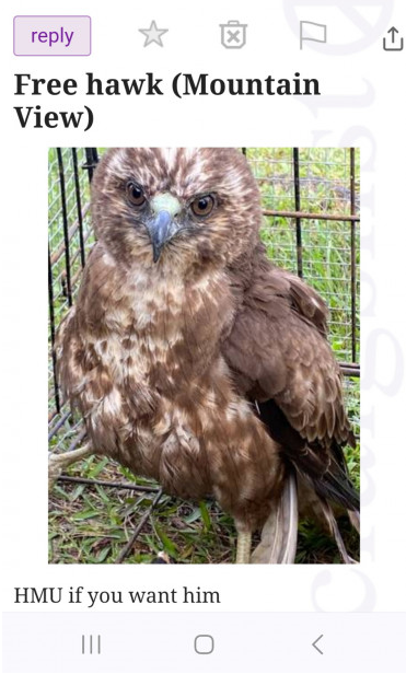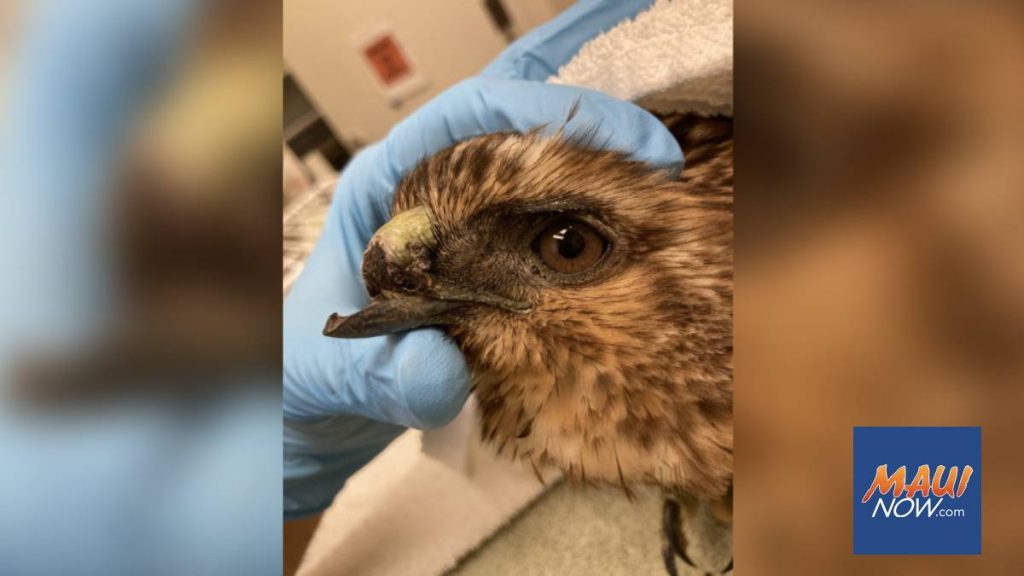 Hawai‘i Wildlife Center received a tip the previous week about a posting on Craigslist that offered a free hawk in Mountain View. Posted photos of that bird showed similar feather, eye and cere (lump above the beak) color to the hawk they admitted, though it still had its full beak. The post has since been deleted. It hasn’t been determined if the two incidents are related.