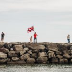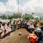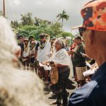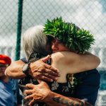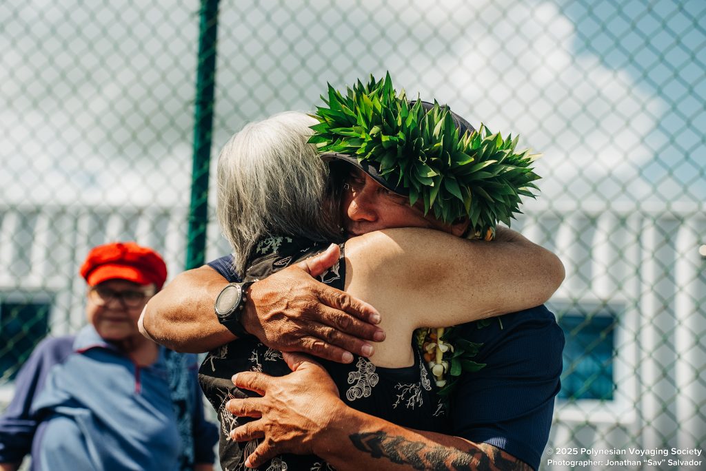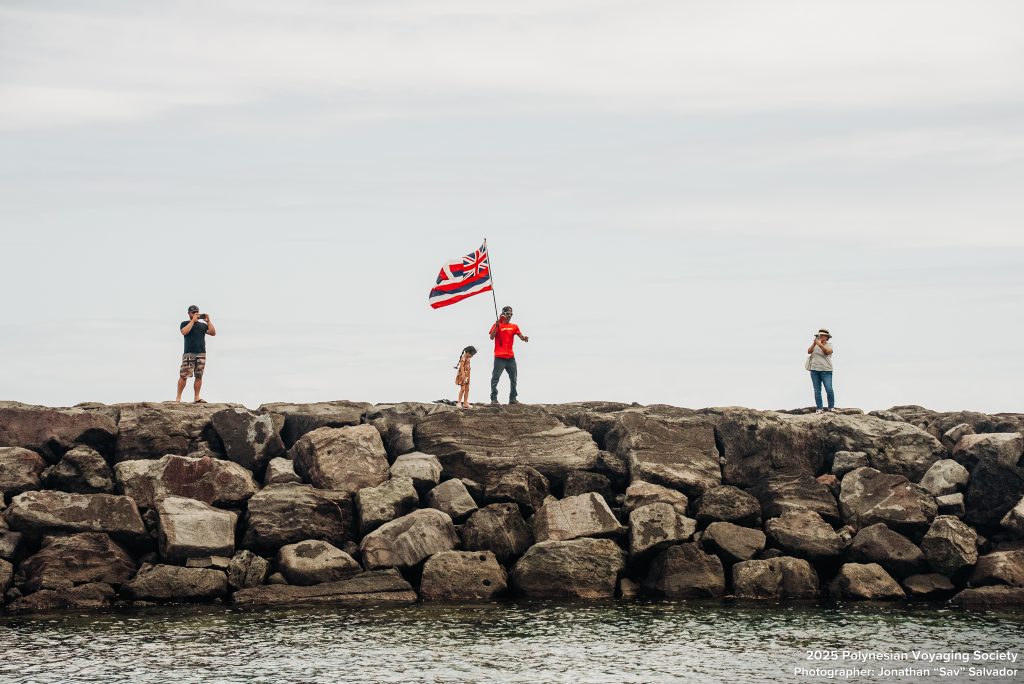 Dozens of family members, supporters and well-wishers gathered on the dock at the Port of Hilo and along the shoreline of Palekai to bid a fond farewell to the crew. Many shared lei and tearful embraces with the crew before they boarded the canoes to embark on the approximately three-week journey to Tahiti. Lei lovingly crafted by the Hilo community were delivered from the public viewing area across the bay by Keaukaha’s wa’a Kiakahi and then draped on the hulls of Hōkūleʻa and Hikianalia.