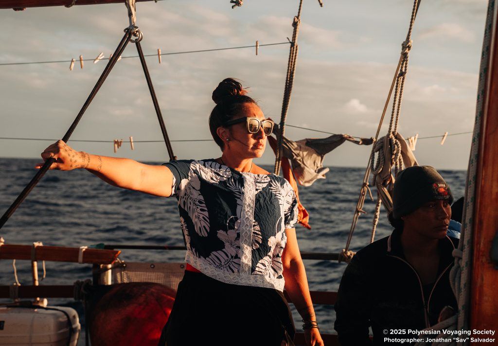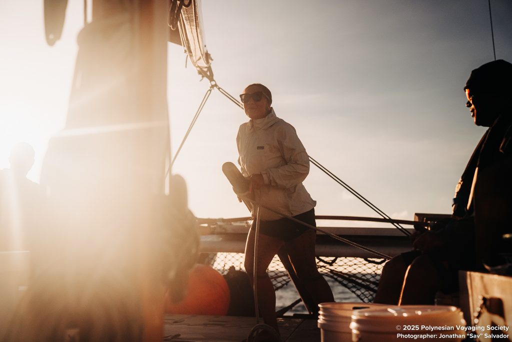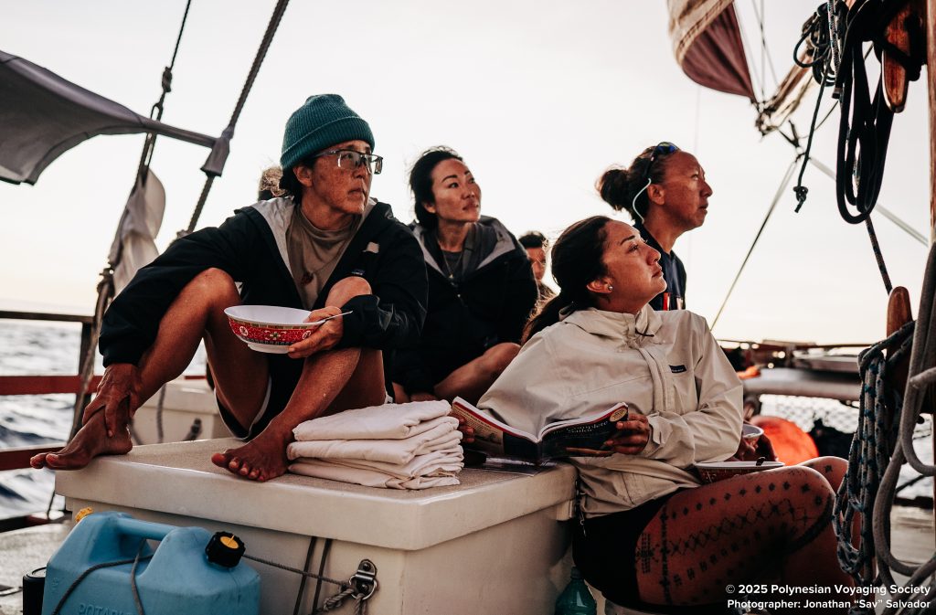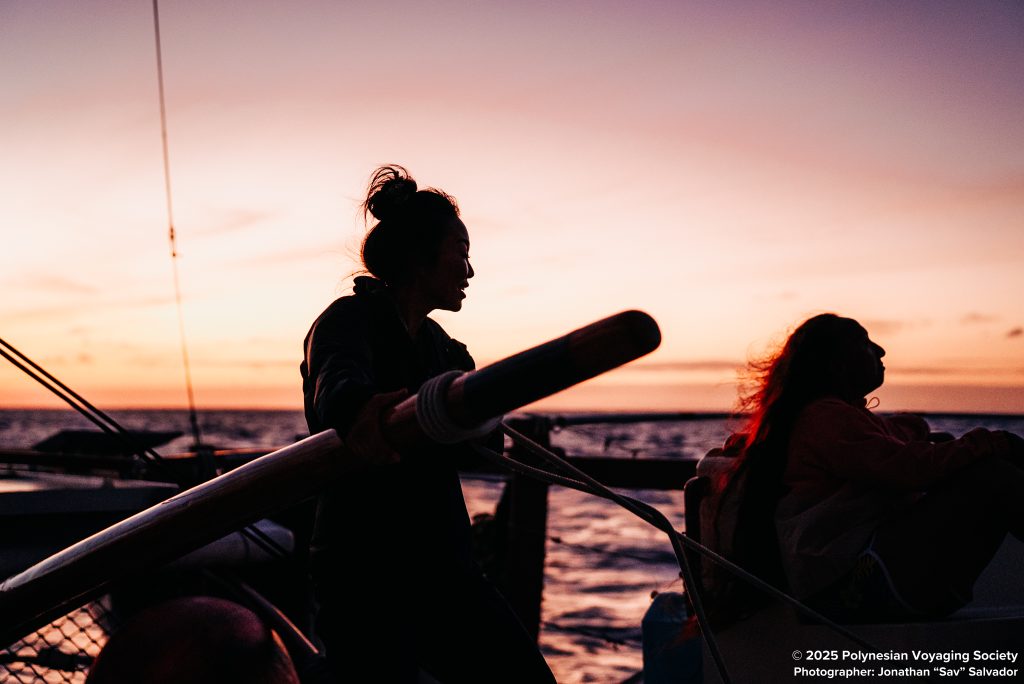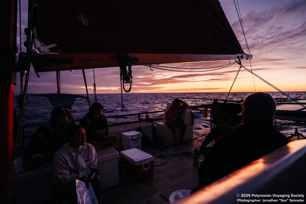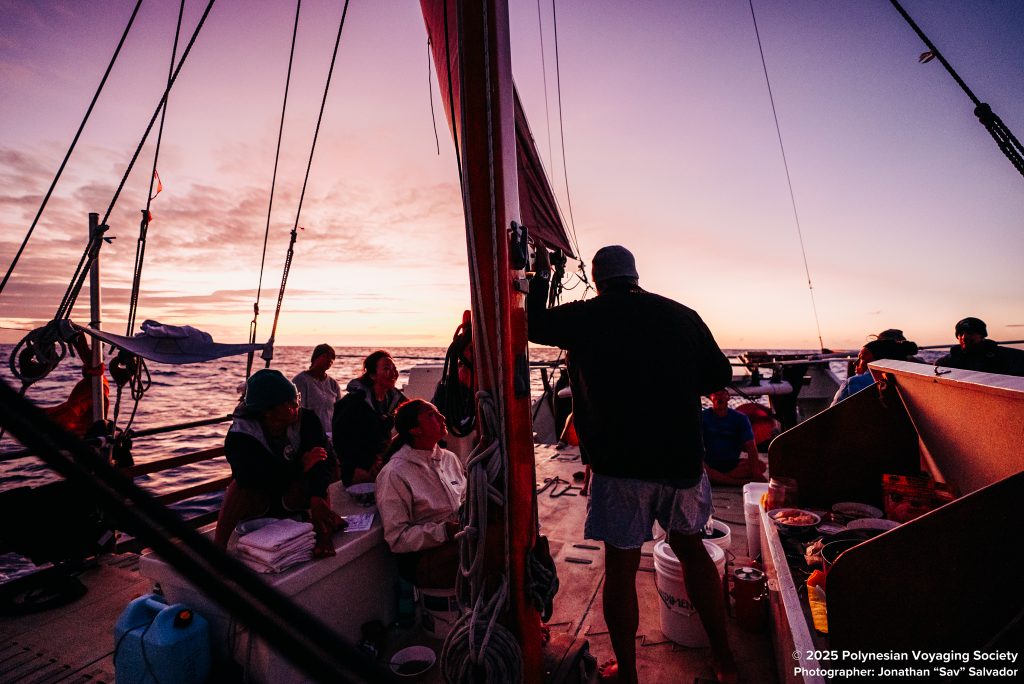 Hōkūleʻa, captained by Polynesian Voyaging Society CEO and Pwo Navigator Nainoa Thompson, is sailing with a smaller crew focused on nature and navigation immersion. Meanwhile, Hikianalia, captained by Archie Kalepa, serves a dual role: in addition to fulfilling educational, documentation, and storytelling responsibilities, the canoe serves as a safety escort for Hōkūleʻa, always following from behind but keeping her in sight. The canoe carries a larger crew made up of seasoned voyagers and first-time long-distance crew members. Every evening, Pwo Navigator Bruce Blankenfeld shares his manaʻo, stories and teachings with the Hikianalia crew gathered on deck.