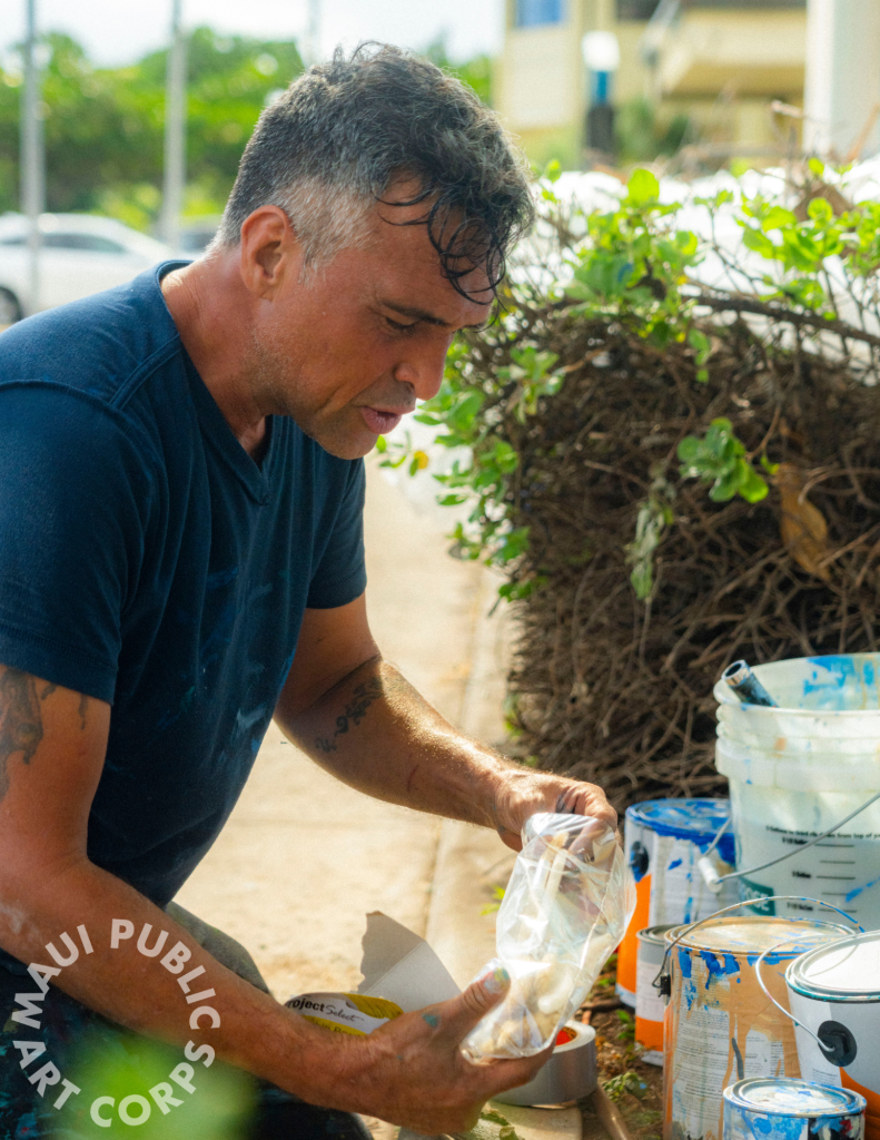 “At its core, our public art program is about connection—to place, to people, and to story,” shares Kelly White, manager of the County of Maui’s public art program and Chair of Maui Public Art Corps, “What we’re seeing here is more than a mural; it’s a blueprint for how we can uplift cultural knowledge, amplify community voice, and reimagine public space through creativity, care, and deep collaboration. Solomon Enos brings an extraordinary ability to listen, interpret, and translate community stories into artwork that is both visually powerful and spiritually resonant. Uncle Gaby reminds us what’s possible when we design with, not just for, our community.”