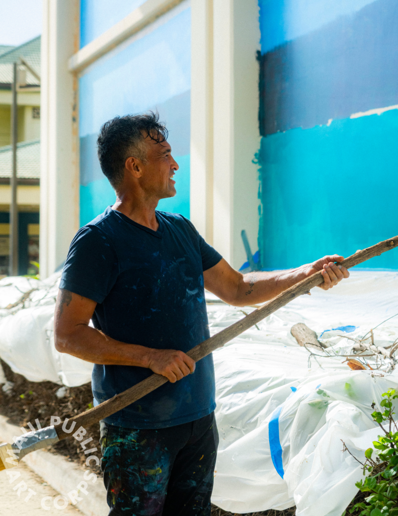 Inspired by a 2023 talk-story between Uncle “Gaby” Gouveia and Pualani Enos, Solomon’s mural is the result of deep community collaboration—featuring a paddling session at Nā Kai ʻEwalu, hula with kūpuna of the Kahului YMCA, community consultations and workshops exploring ʻōlelo noʻeau and Kahului’s cultural roots. The culmination of deep engagement with Maui’s people, mo‘olelo, and land, this public artwork is as much by the community as it is for it.