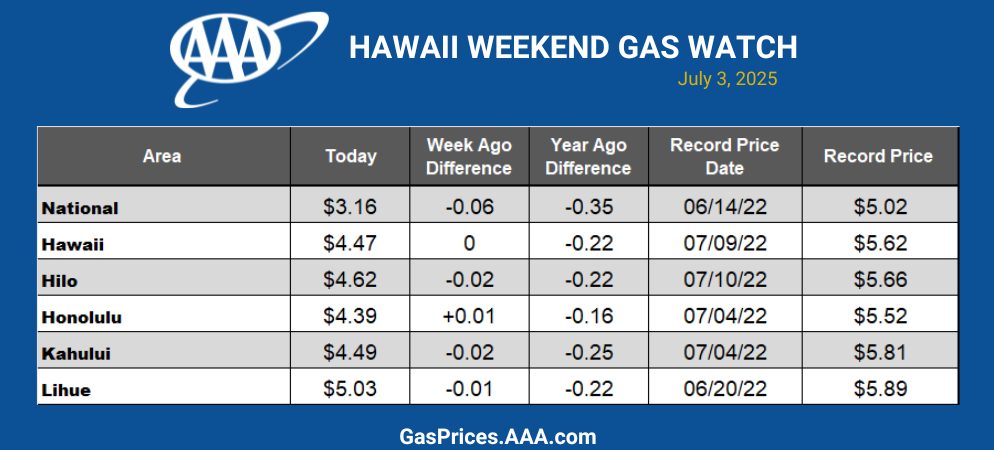 While a record number of local residents are taking Independence Day holiday getaways, gas prices are holding steady in Hawaiʻi, according to the AAA Hawaiʻi Weekend Gas Watch. The statewide average price for regular unleaded is $4.47, which is the same as last week and 22 cents lower than at this time last year. The average national price is $3.16, which is six cents higher than last week and 24 cents less than a year ago.