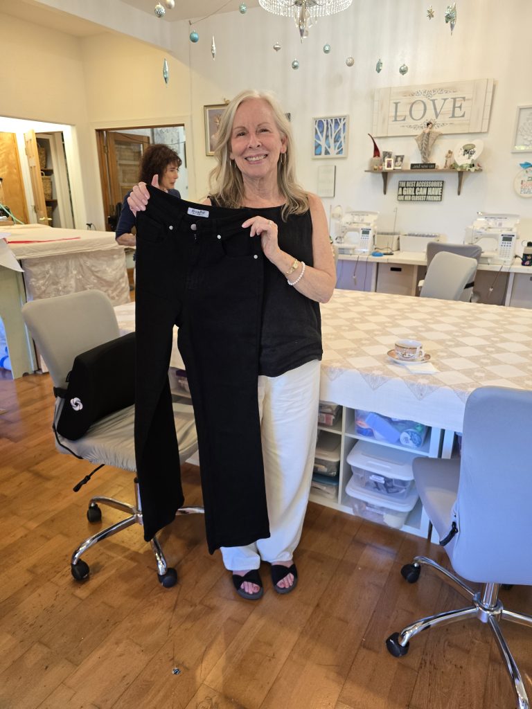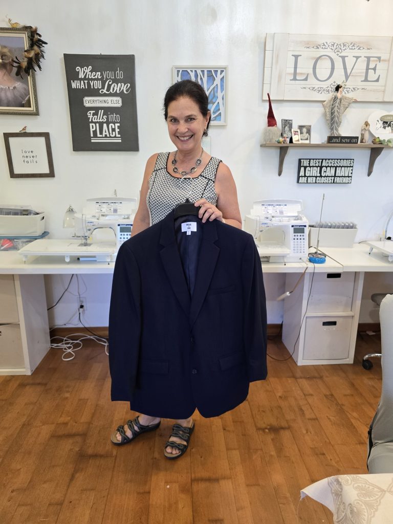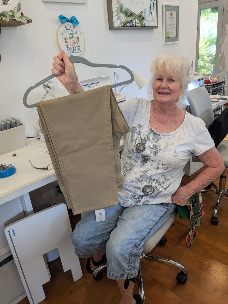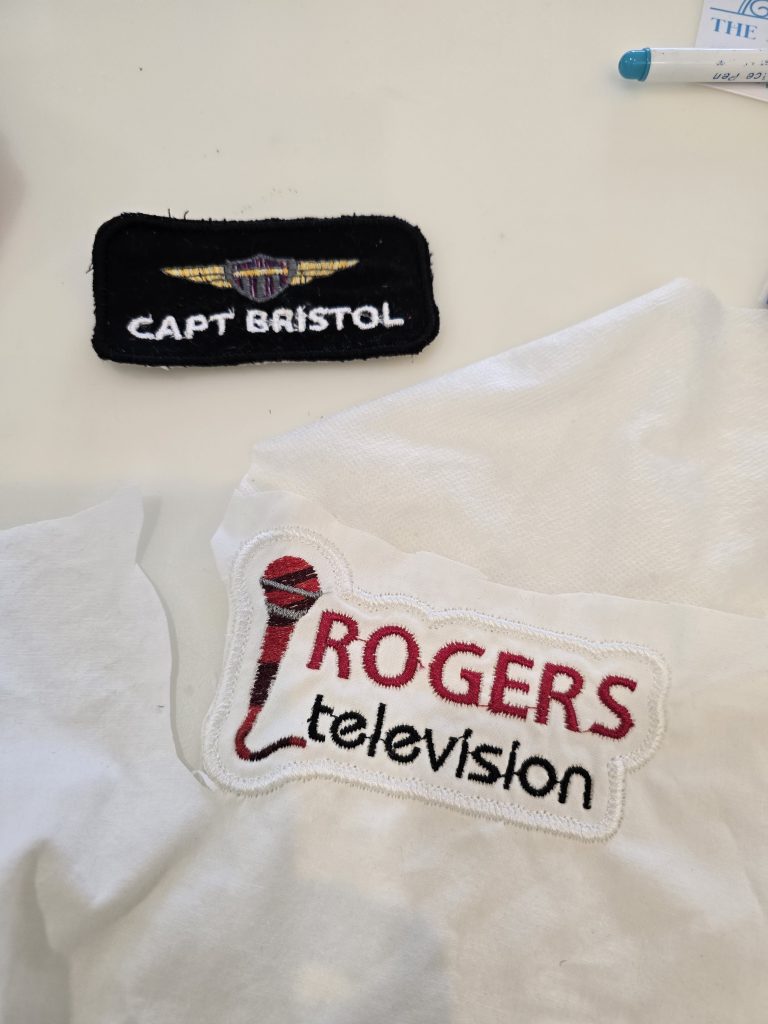 Sewing Hui volunteer Lynne Donaldson used her embroidery machine to create custom patches for the Walmart greeter apron and for TV reporter Janice Mosher, played by Amber Rose Seelig and Lily Werner. She also created a name patch for Captain Bristol, the Virgin Atlantic pilot played by Daniel Church.