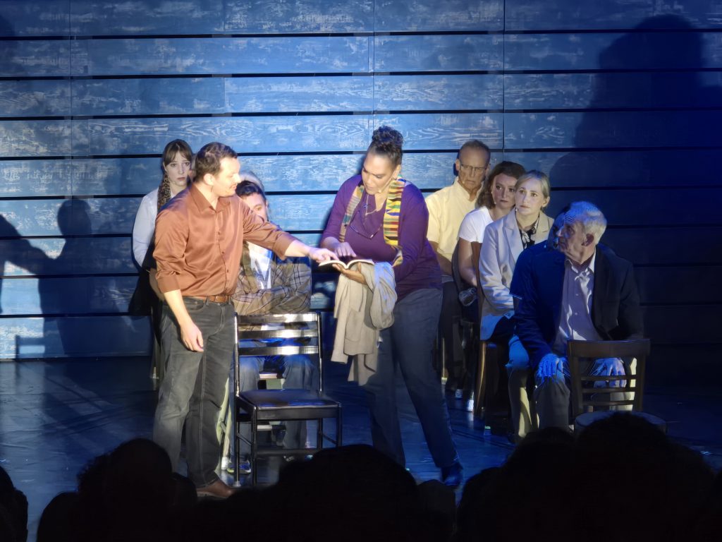 Some changes require coordination between actors. For example, actor Josh Pelletier transforms from passenger Kevin T to Garth, the head of the local union, by simply removing his leather jacket onstage. Another actor whisks it away, and just like that, he’s someone new.