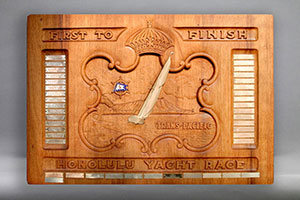 There are several prestigious trophies awarded in the Transpac race. The Barn Door Trophy is a striking four-foot slab of carved Hawaiian koa wood, presented to the monohull that completes the course in the fastest elapsed time. This trophy displays plaques honoring many legendary ocean racing yachts. The Merlin Trophy is awarded to the first monohull to finish without moveable ballast or other high-performance features. And the Rudy Choy Perpetual Trophy is presented to the fastest multihull to complete the course.