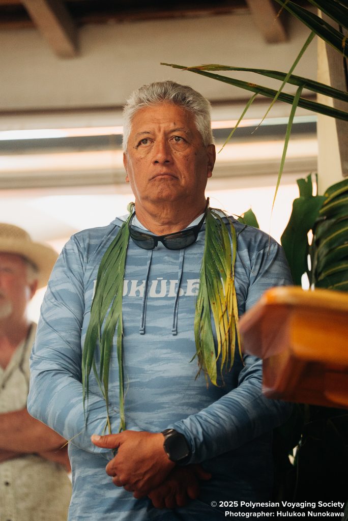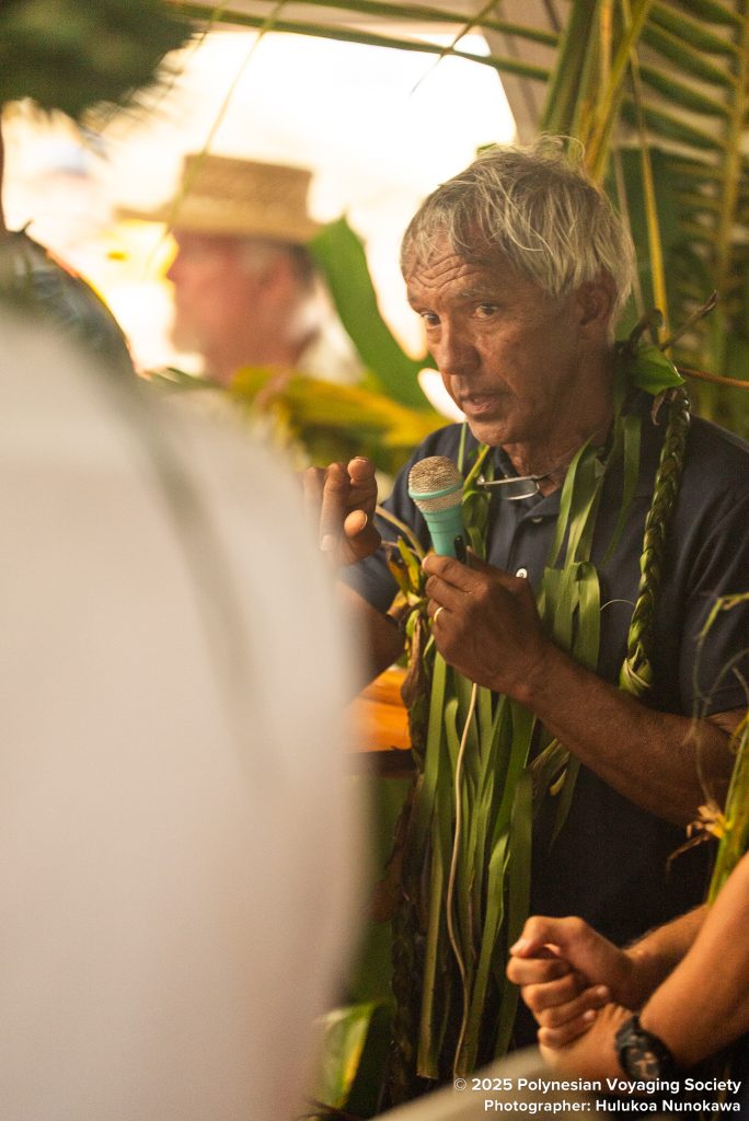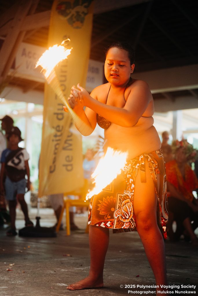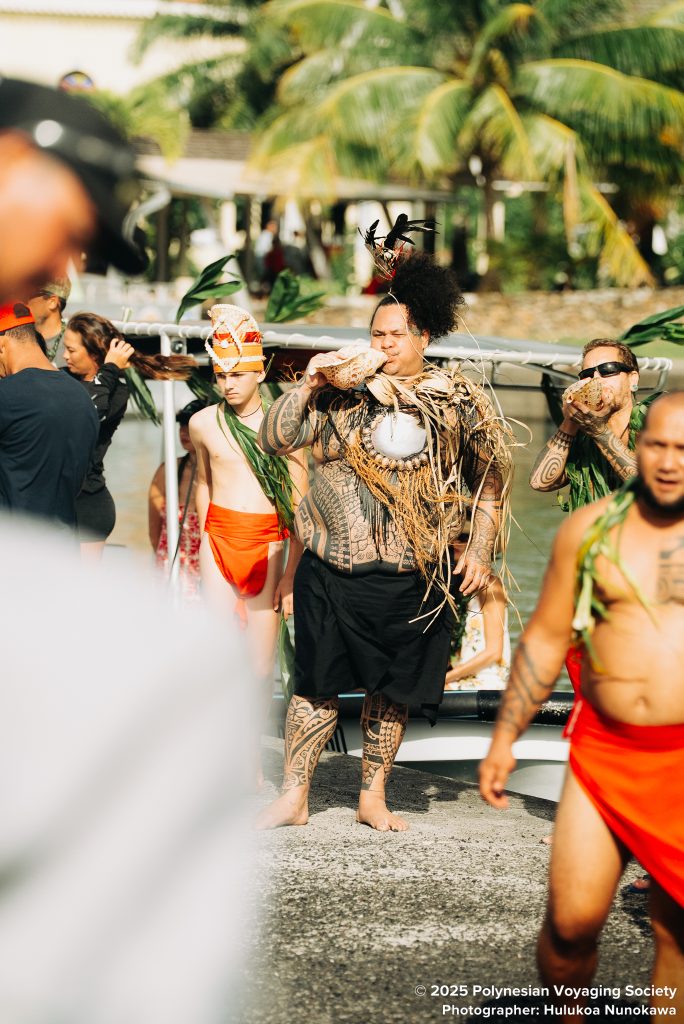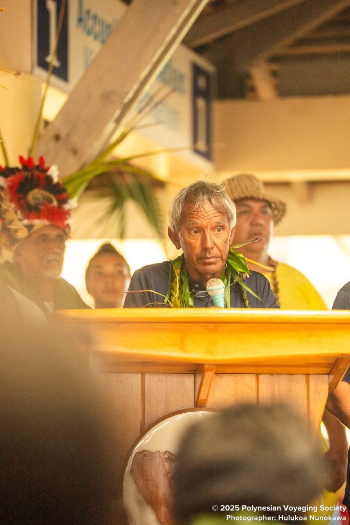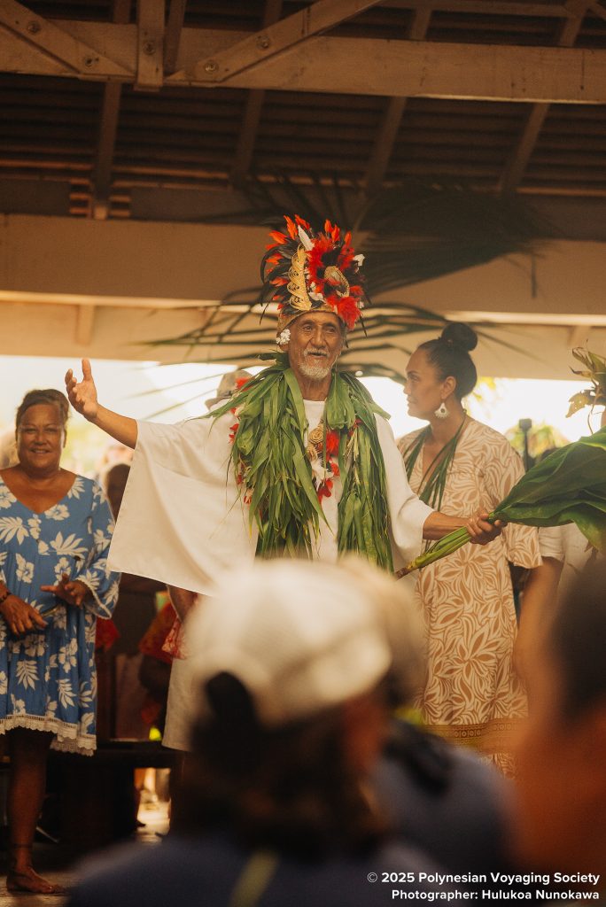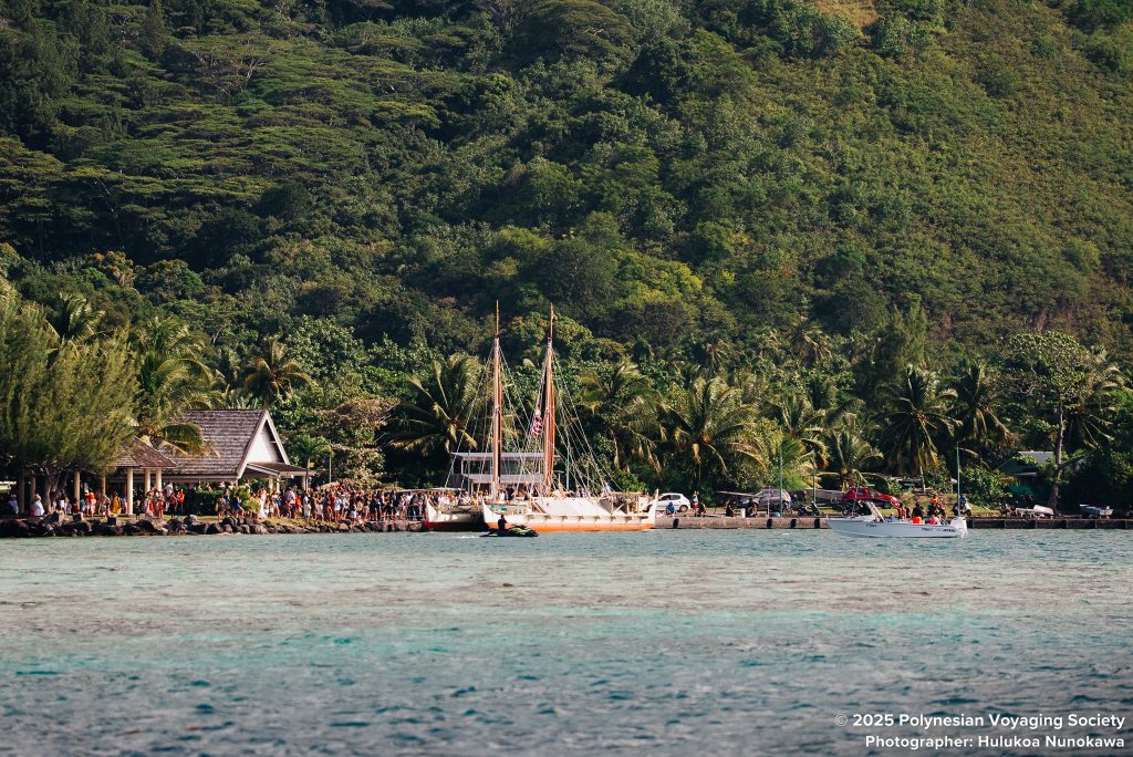 On Friday, July 11, Hōkūleʻa and Hikianalia sailed to Paopao Bay on Moʻorea, docking at the tourism office dock. The crews were honored with a humble and heartfelt arrival ceremony, which included a greeting at the pass entrance by the youth of Moʻorea’s traditional canoe Honoura of the ʻAimeho Vaʻa Taʻie organization, symbolizing the generational continuity of voyaging knowledge. Community representatives delivered speeches alongside the mayor of Paopao, and elders offered a traditional song accompanied by the Tahiti Choir.